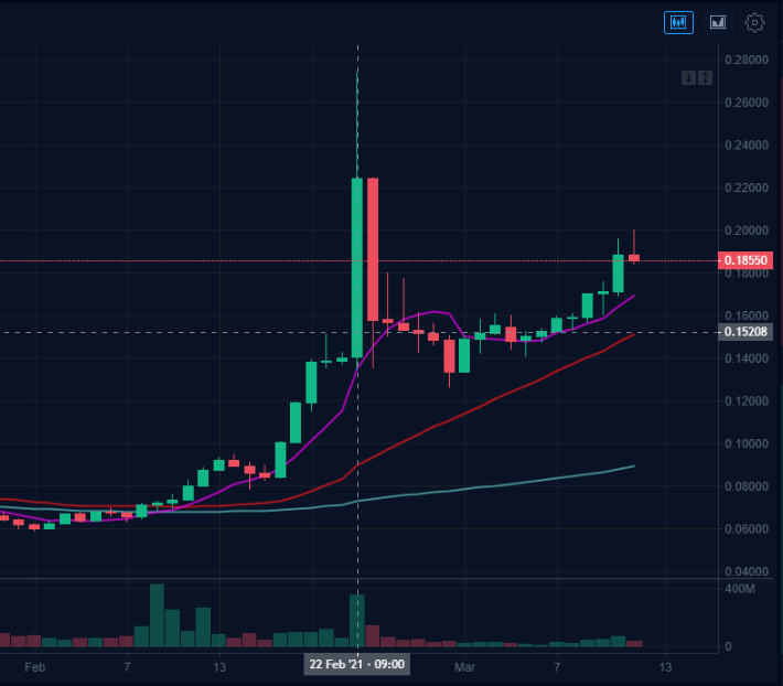 위의 차트를 보시면, 2021년 02월 22일 ~ 23일에 크립토닷컴체인 시세가 폭등했다가 다시 폭락했다는 것을 알 수 있습니다.