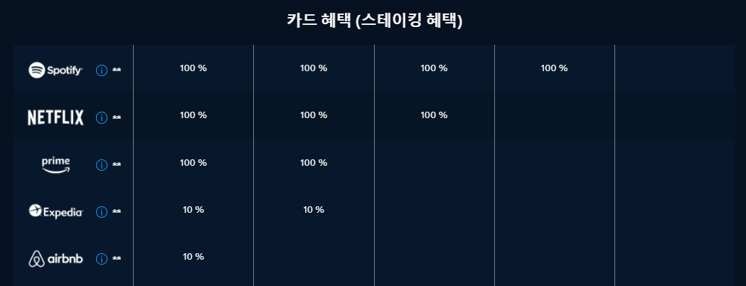 카드의 종류가 여러 가지 있고, 심지어 스포티파이, 넷플릭스, 아마존 프라임 등을 크립토닷컴체인 카드로 결제했을 시에는 포인트도 적립된다고 합니다.