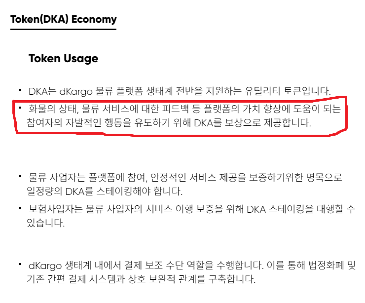 "디카르고 토큰(DKA)는 디카르고 물류 생태계 안에서 사용되는 가상화폐로,