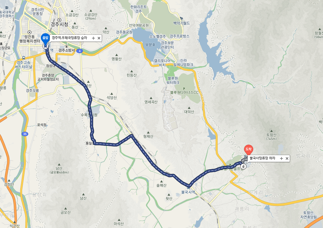40분가량 버스를 타고 가신 뒤, 위의 불국사 버스정류장에서 하차하시면 됩니다.