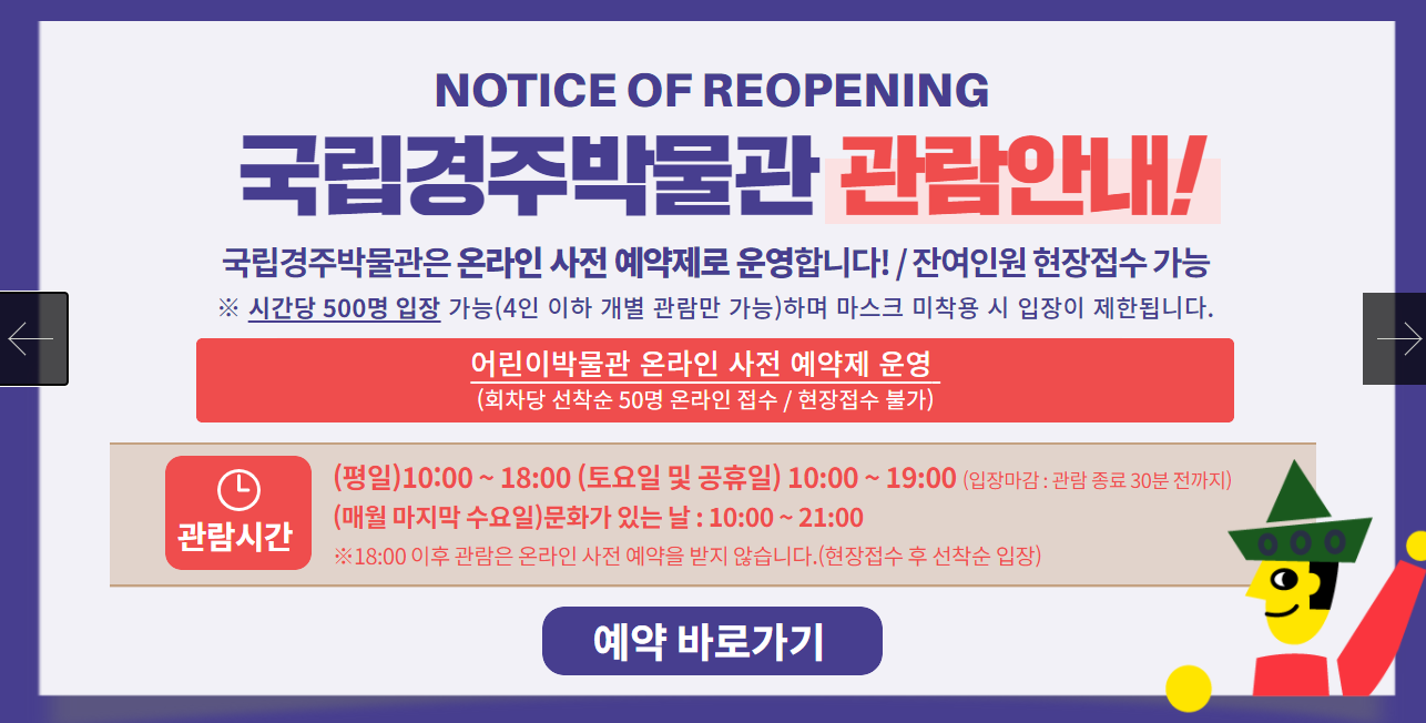 그래도 혹시 모르니 국립경주박물관 관람 예약을 할 수 있는 링크를 남겨두도록 하겠습니다.