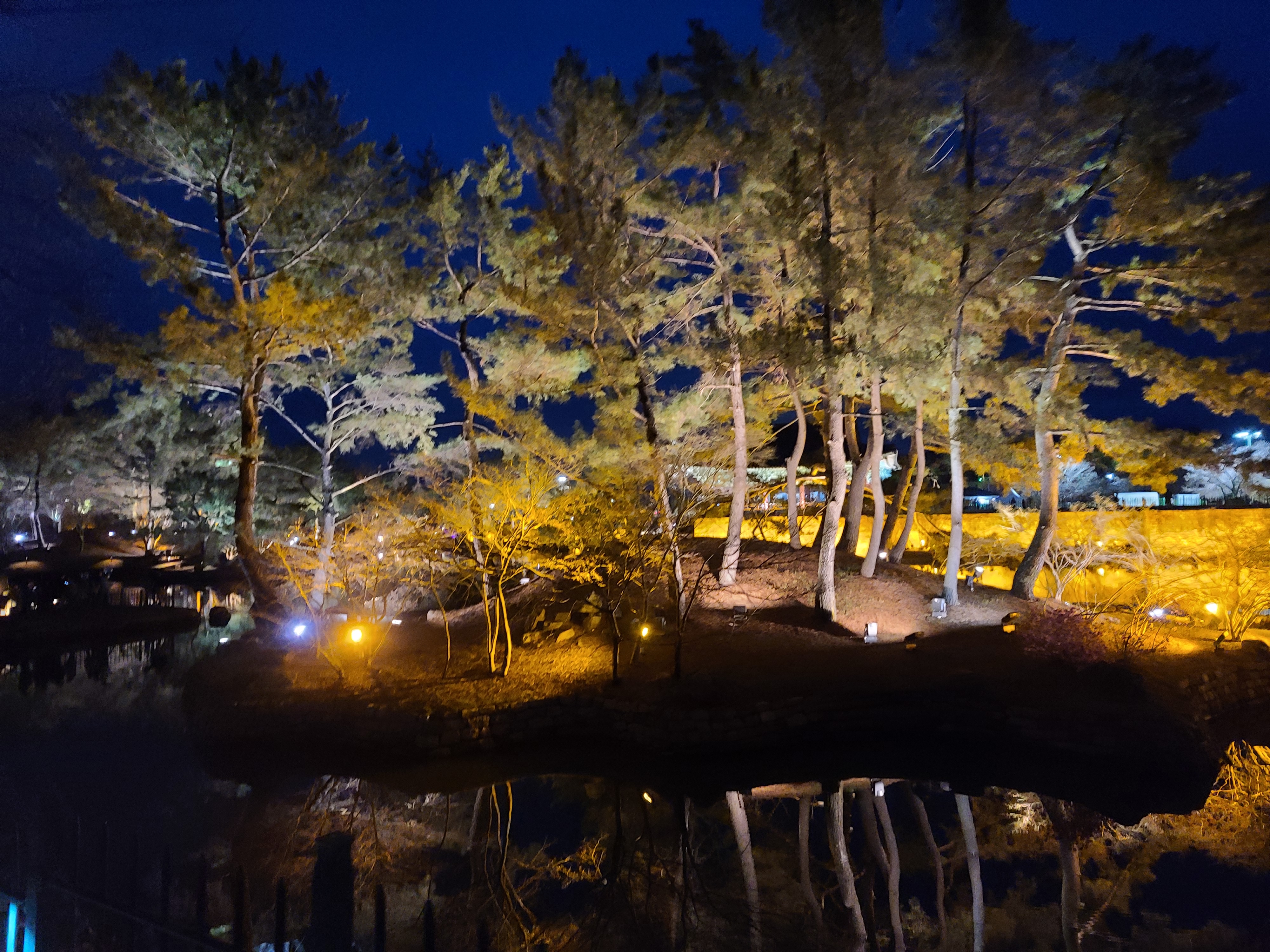 연못, 소나무, 그리고 한옥 건물과 어우러지는 예쁜 조명들이 만들어내는 야경은 정말 멋있습니다.