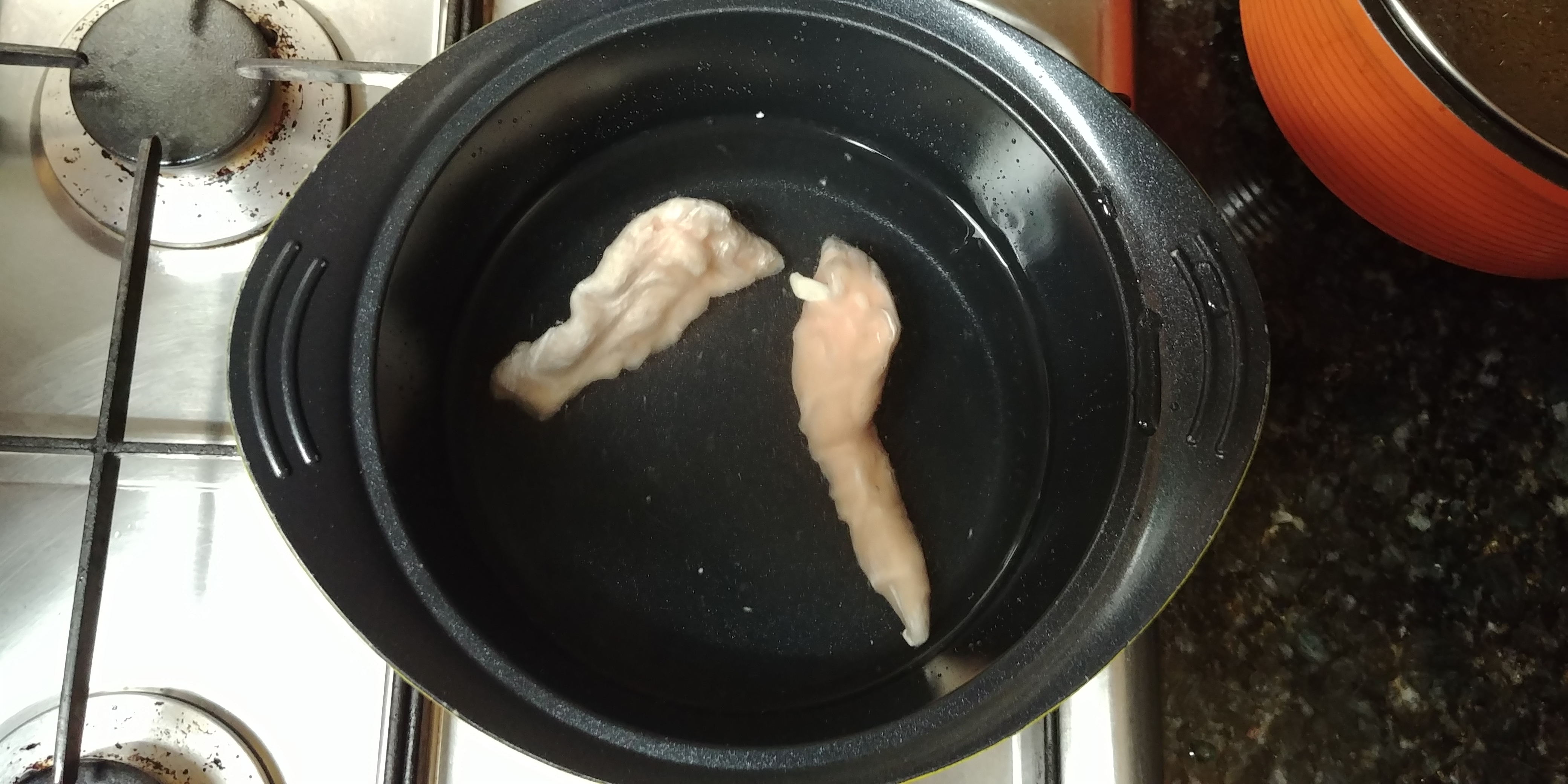 이렇게 그냥 끓여줍니다. 끓지 않는 물과 냉동 닭안심살 두 덩이가 담긴 냄비를 강한 가스불에 올리고 약 6~7분 정도 삶았더니 위의 동영상처럼 속까지 다 익게 됐습니다. 제가 두 덩이만 넣었기 때문에 7분만 삶아도 다 익은 겁니다. 약 4~5 덩이 넣으면 최소 10분은 펄펄 끓는 물에 삶으셔야 합니다.