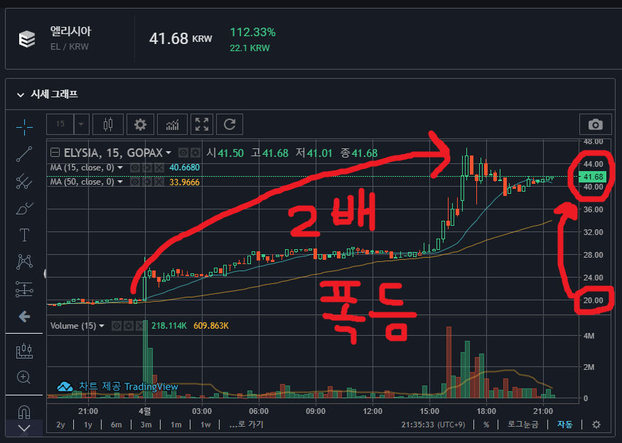 2021년 3월 31일만 해도 20원하던 엘리시아 코인이 단 하루 만에 40원대로 2배나 폭등했다는 것을 알 수 있습니다.