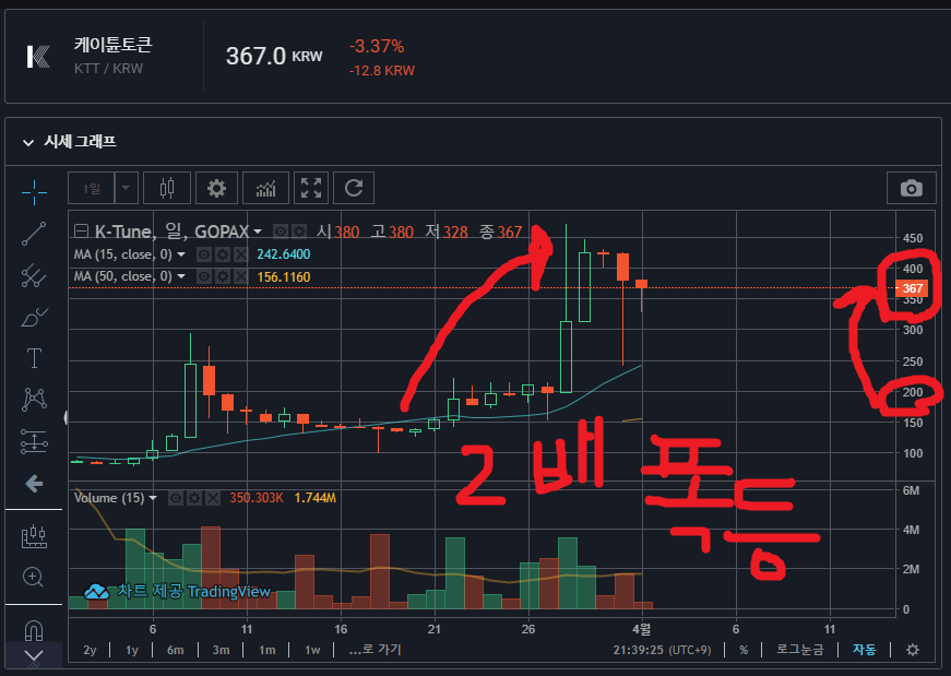 실제로 며칠 전까지만 해도 에어드랍 이벤트로 지급되었던 KTT 코인이 갑자기 폭등하는 일이 일어났습니다.