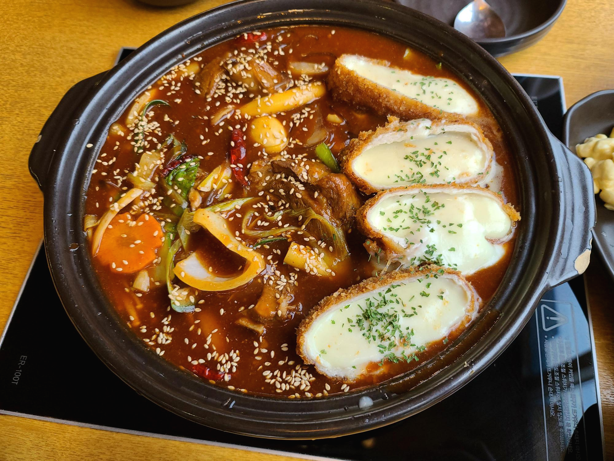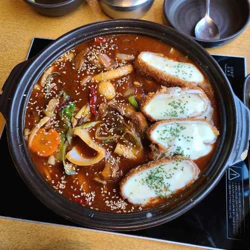 설해돈의 주메뉴는 매갈가스(매운 갈비찜 + 치즈가스), 떡볶가스(떡볶이 + 치즈가스)가 있습니다.