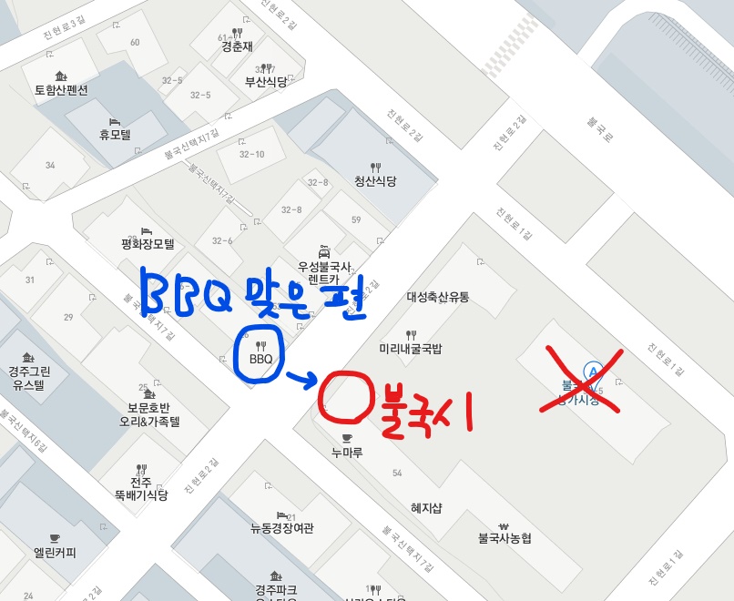 그래서 제가 지도를 캡처하여 불국사 맛집 불국시의 제대로 된 위치를 말씀드려보도록 하겠습니다.