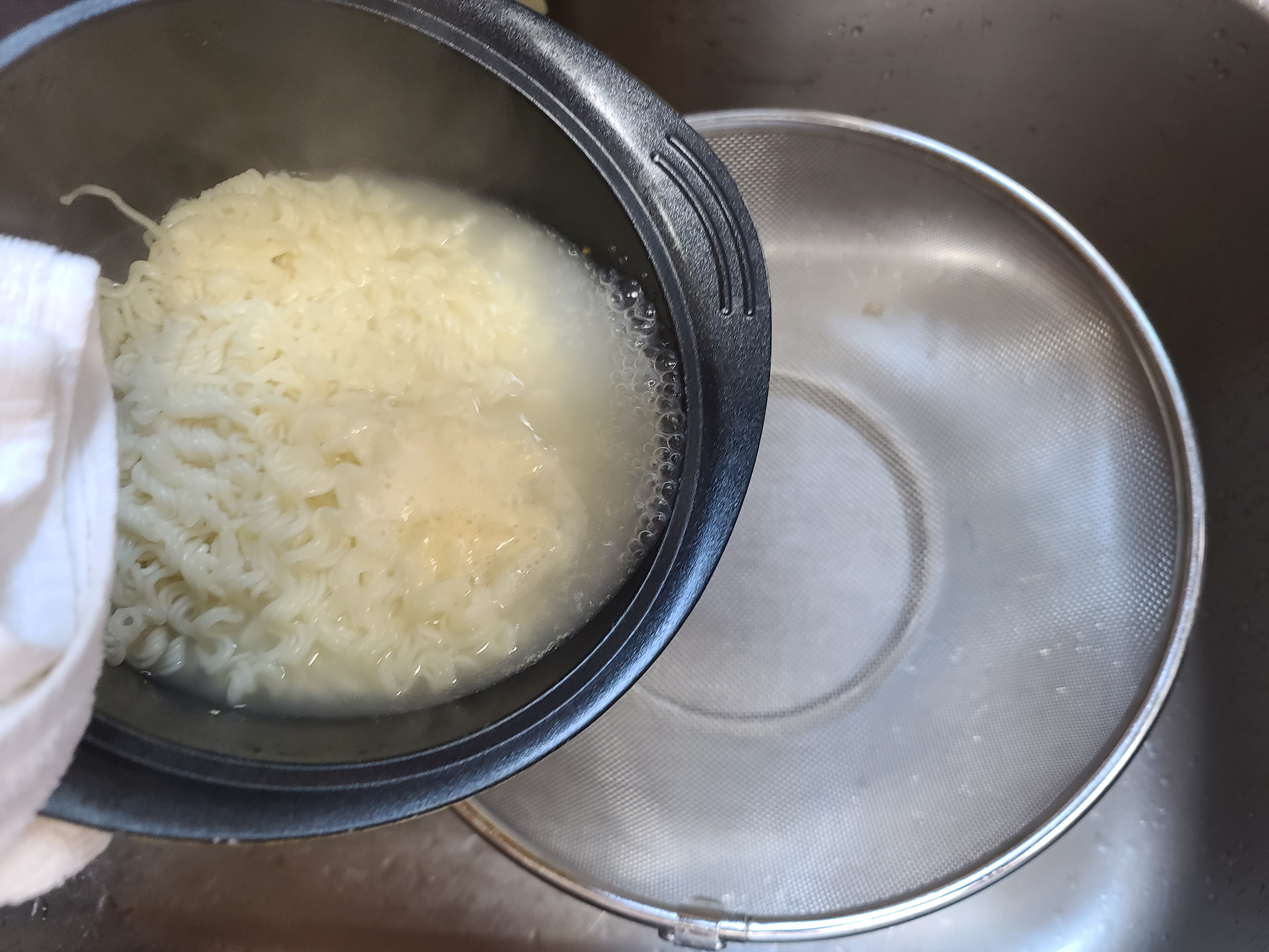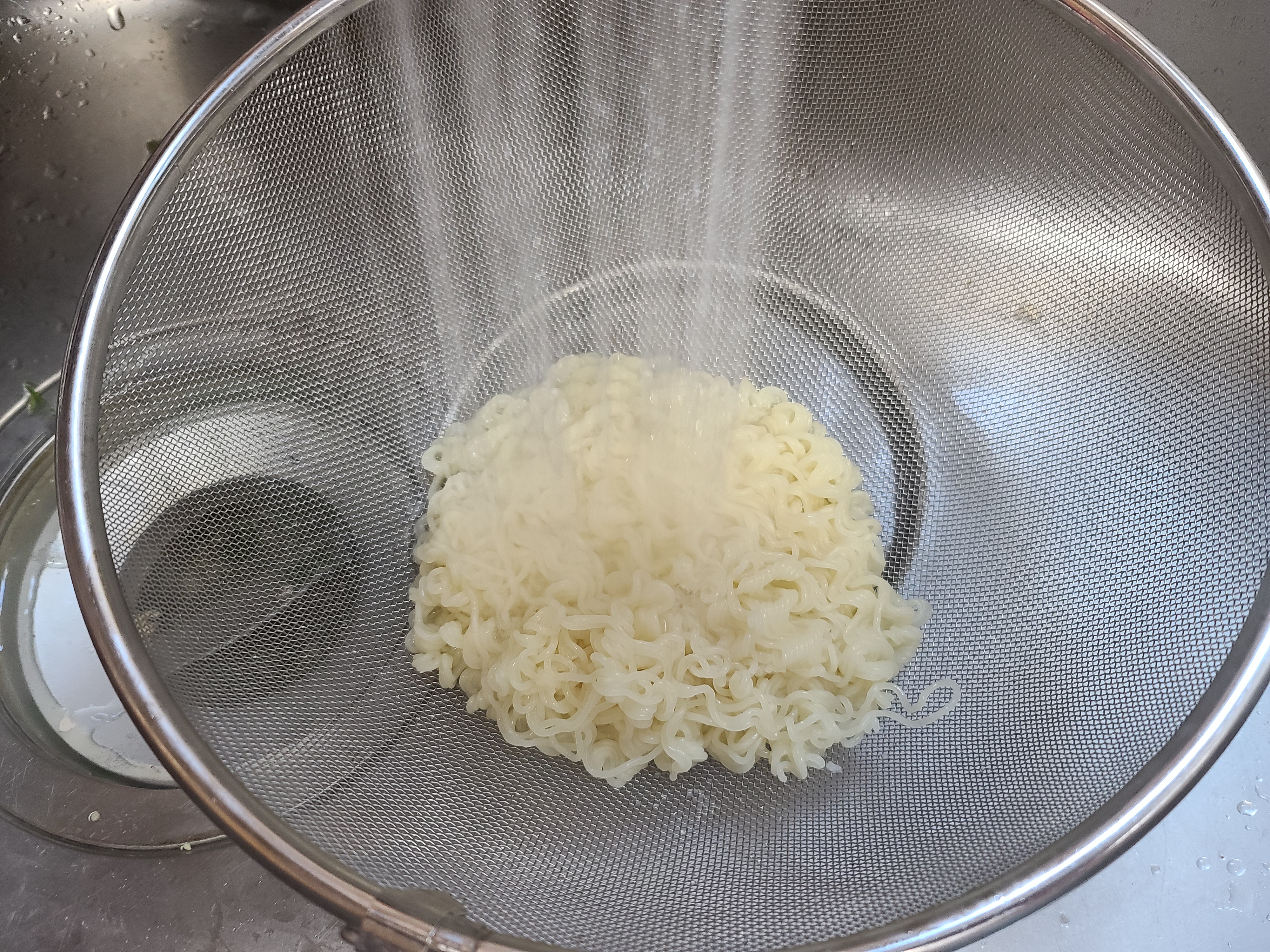 찬물로 헹구지 않으면 면발의 탱탱함이 상당히 감소되기 때문에 바로 찬물 샤워를 해주도록 합니다.