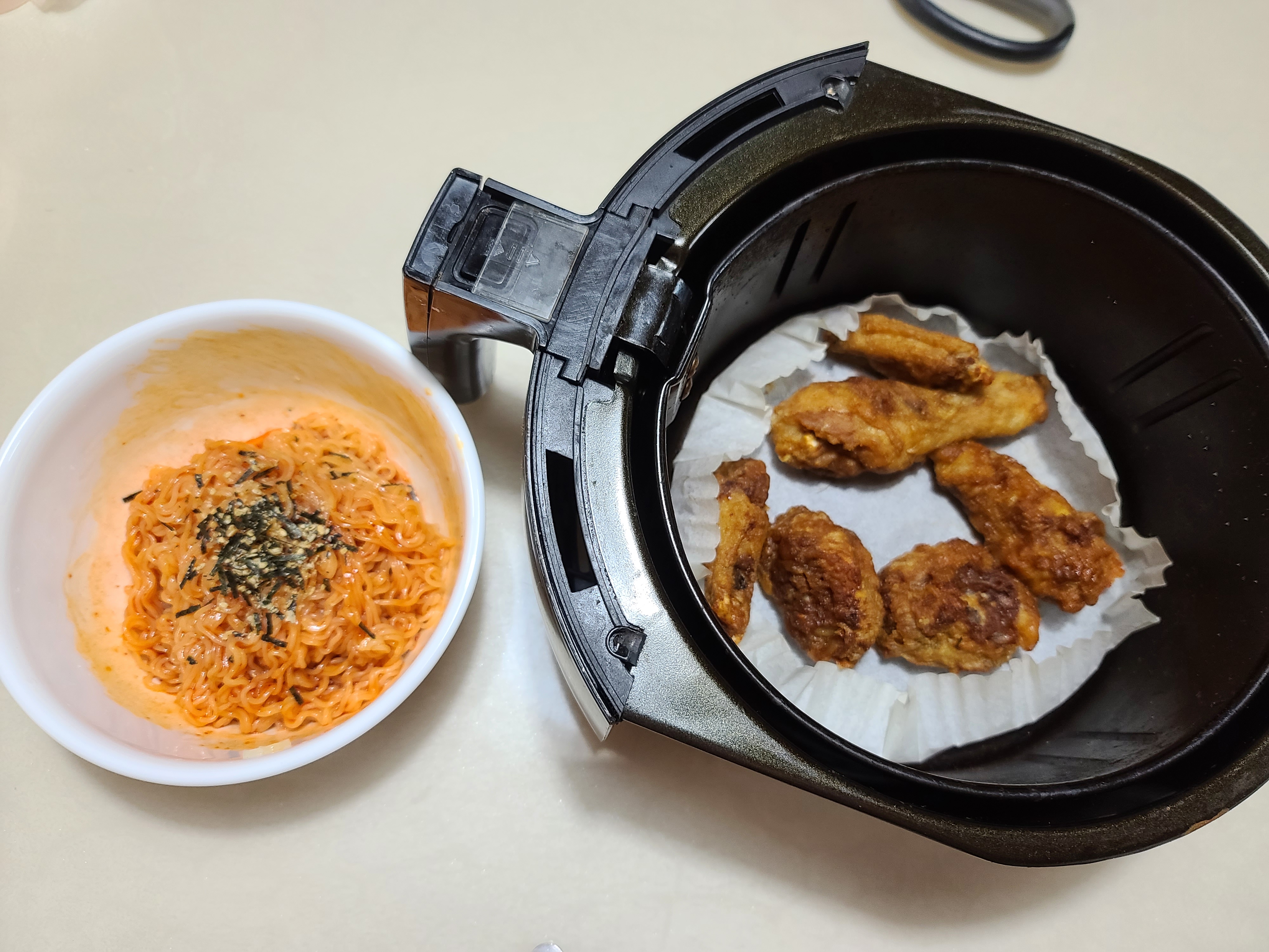 이제 배홍동 비빔면을 어제 먹다 남은 치킨과 함께 먹어보도록 하겠습니다.
