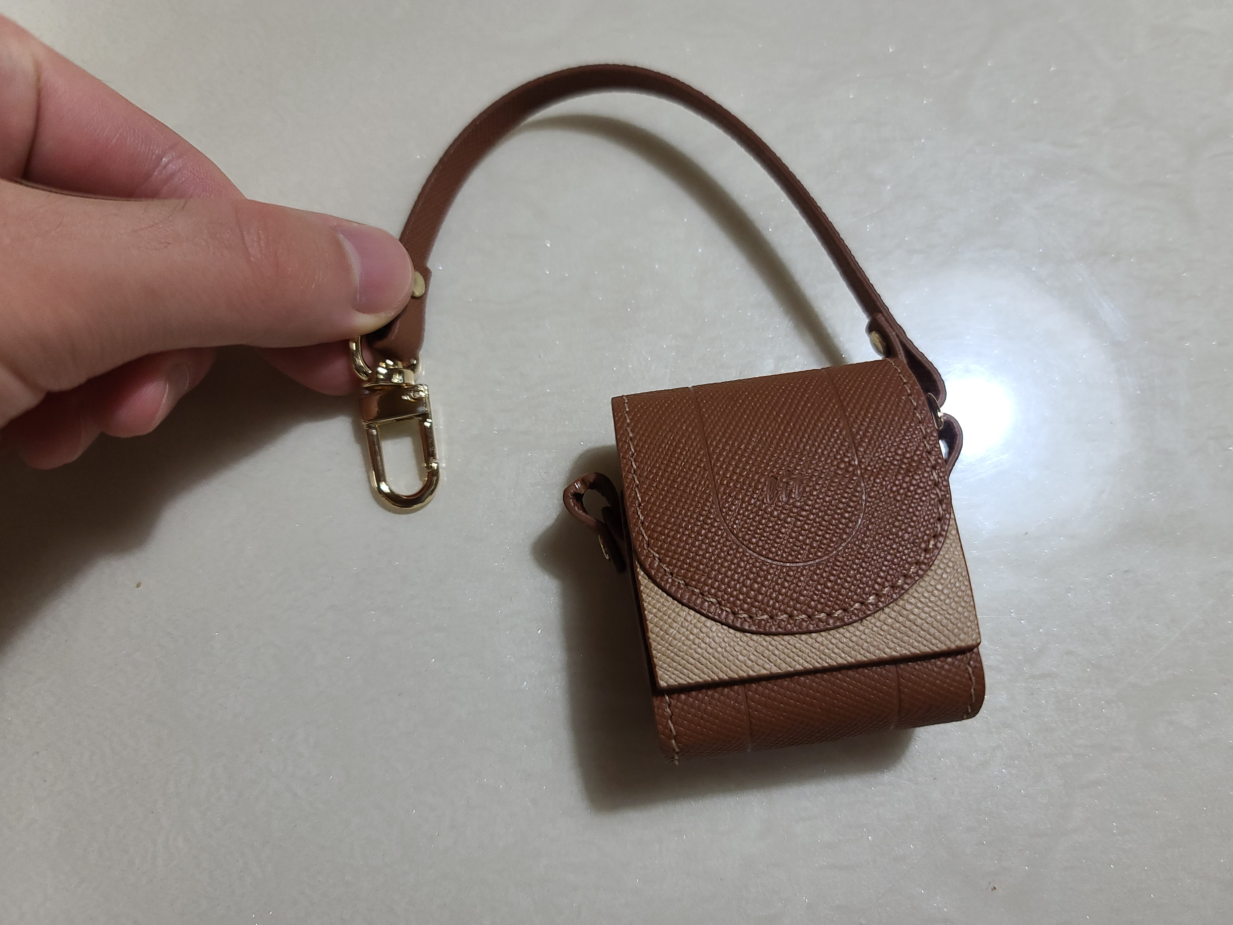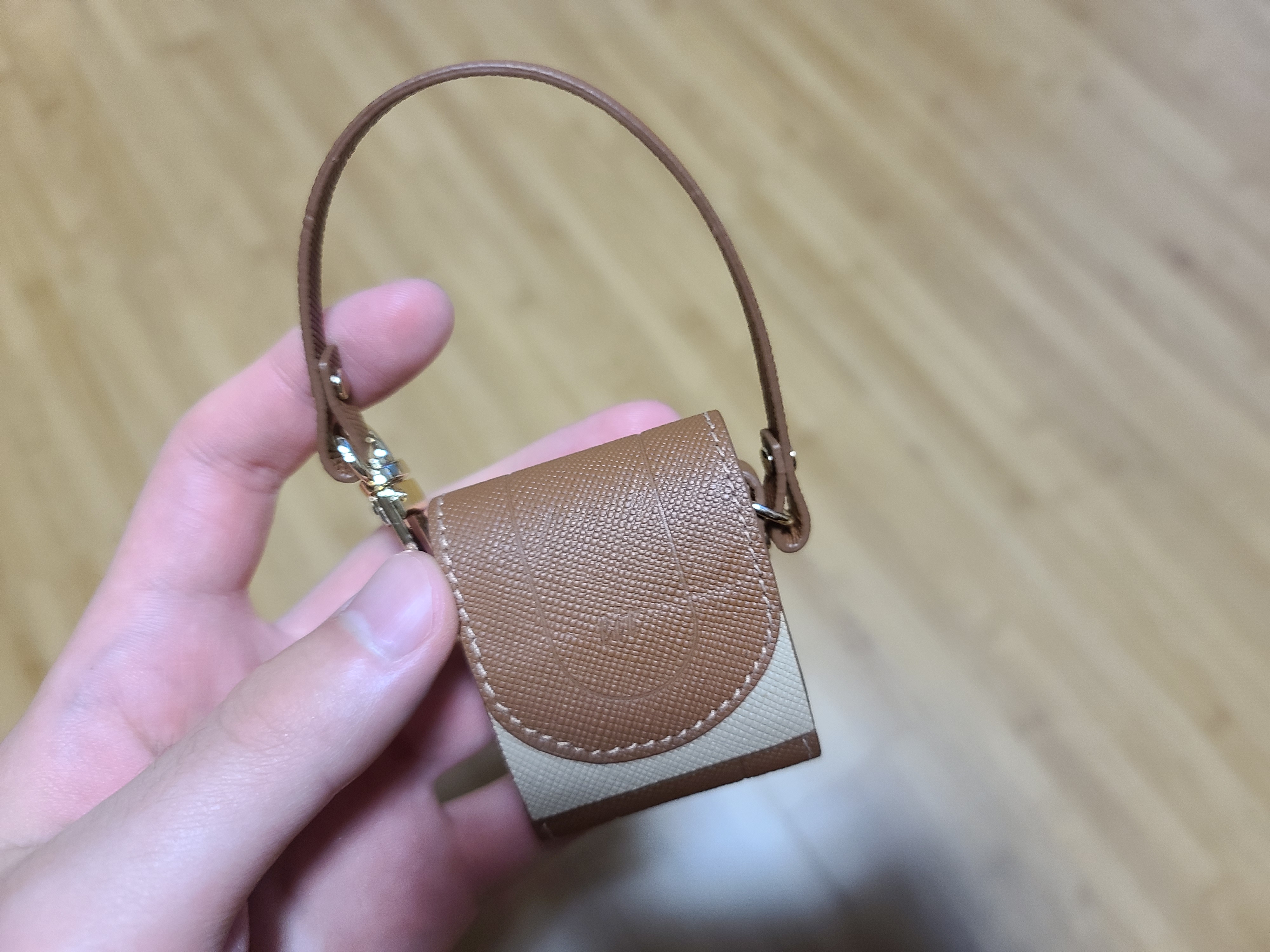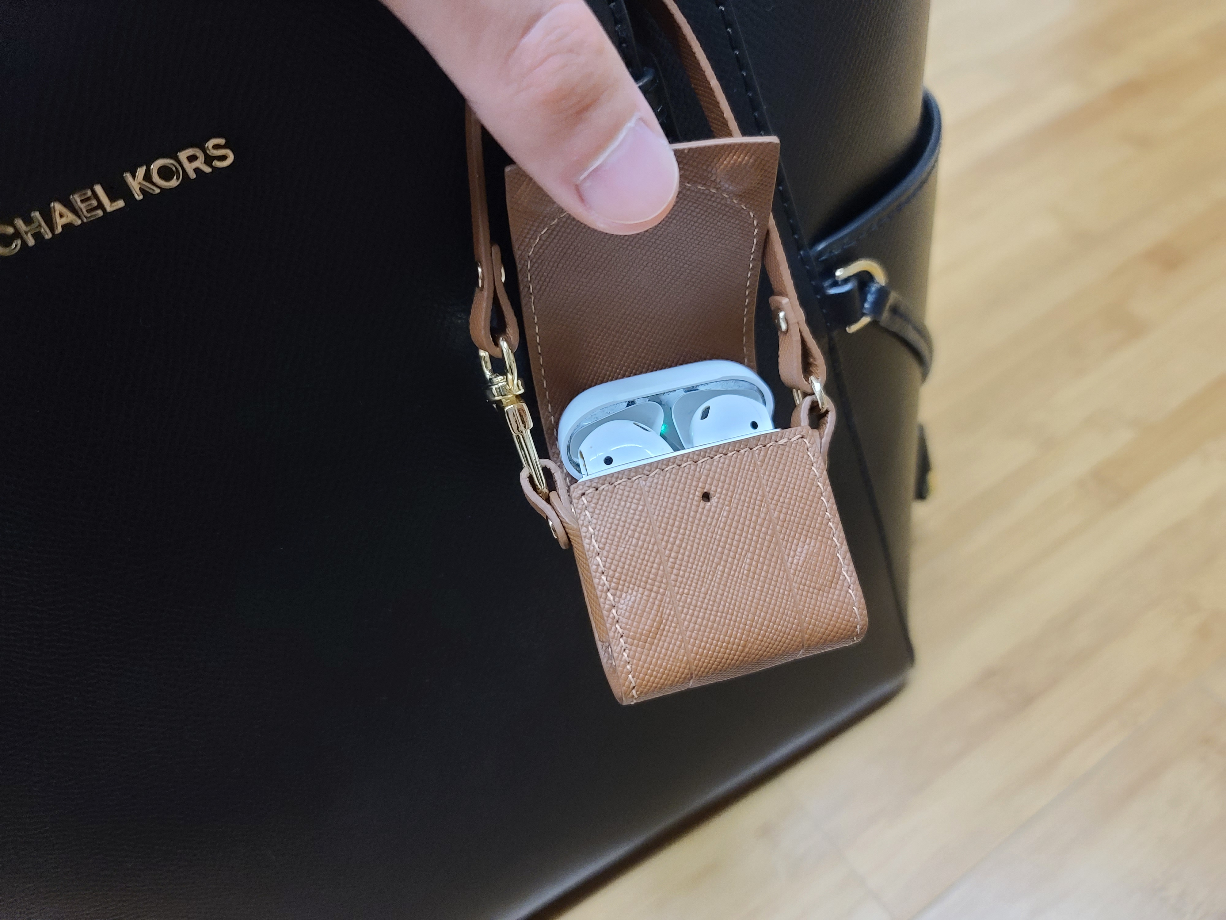에어팟 2세대 가죽 케이스를 다른 가방과 결합한 모습입니다.