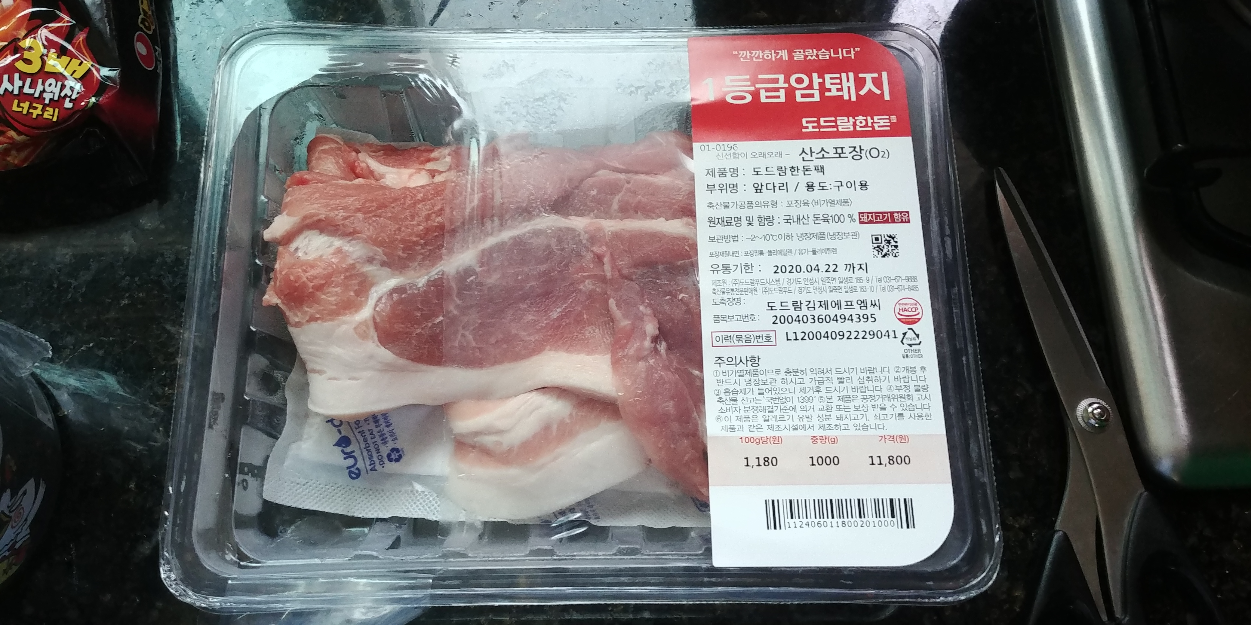 노브랜드에서 구입한 돼지고기 앞다리살입니다. 앞다리살은 가성비가 좋습니다. 앞다리살의 가성비와 노브랜드의 가성비가 만나면 따블 가성비로 완벽한 가성비가 됩니다. 100g당 1,180원이라고 나와있는데, 다른 정육점에서는 얼마에 파는지 솔직히 잘 기억이 나지 않습니다.