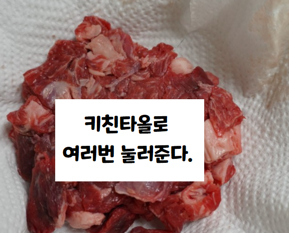 저는 냉장 소고기 양지를 사용했기 때문에 위의 사진처럼 소고기 양지를 키친타월로 여러번 눌러서 핏물을 뺐습니다.