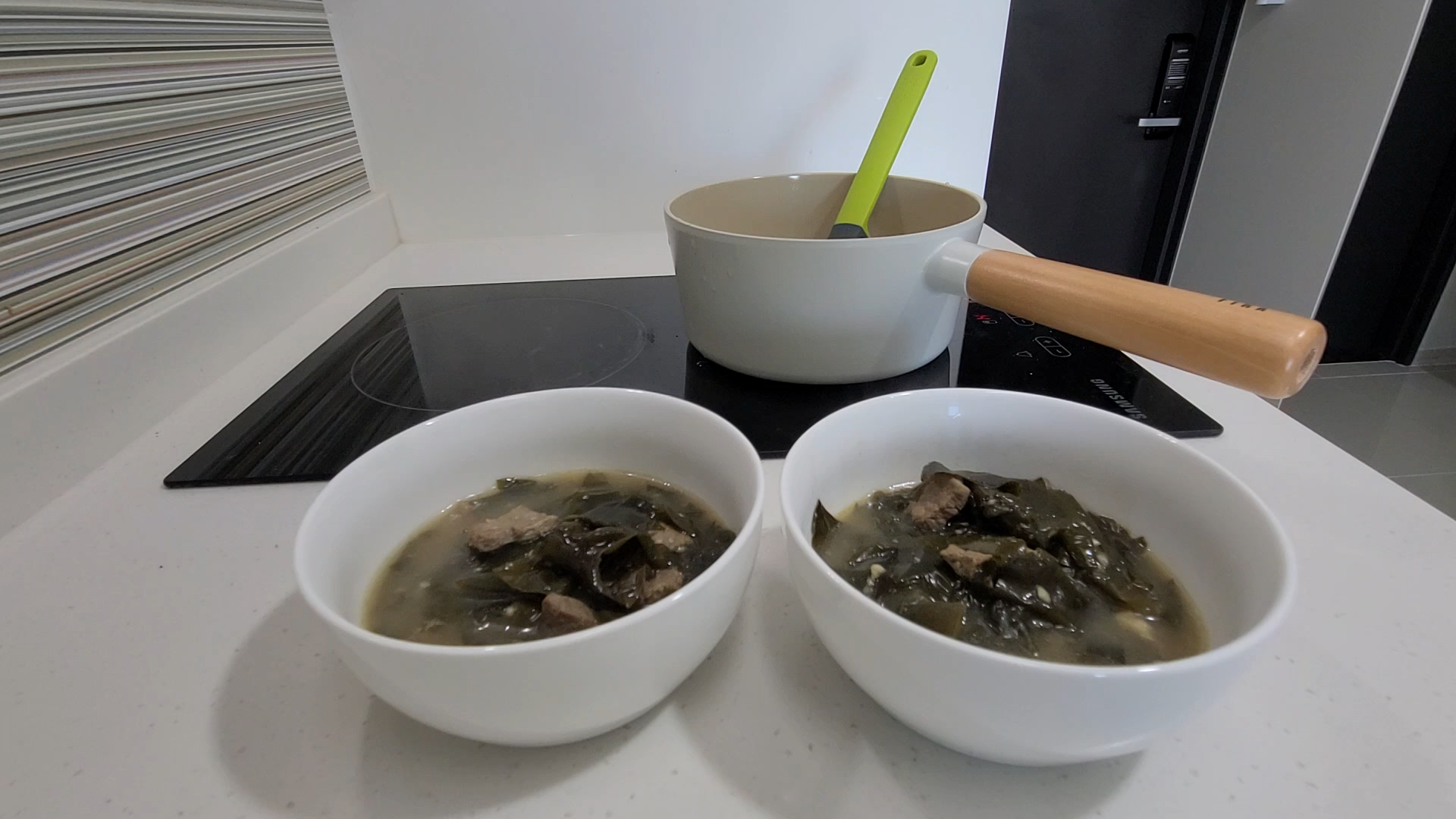 5분 만에 소고기 미역국이 완성됐습니다.