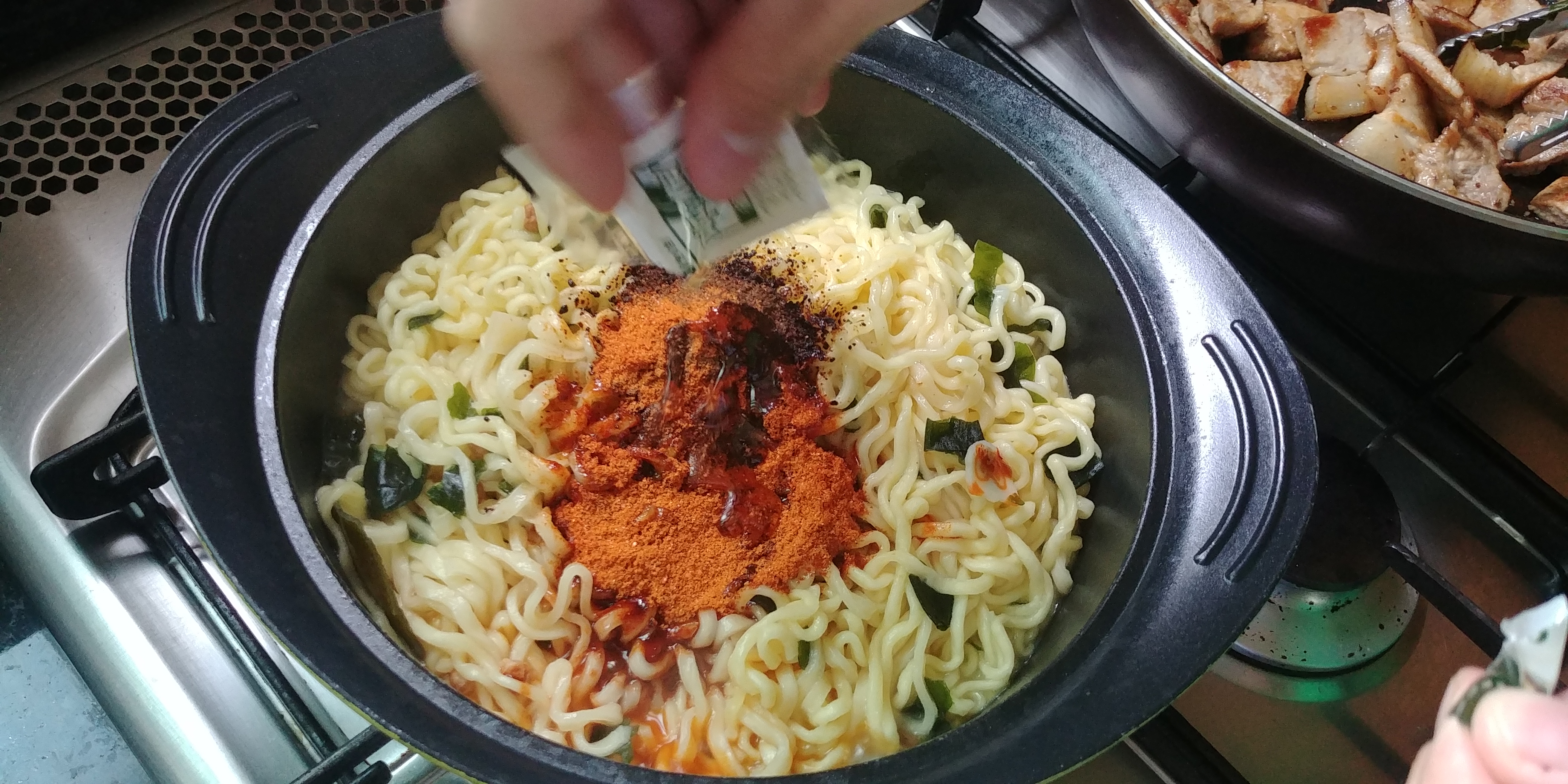 다음으로는 면을 넣고 끓여줍니다. 여기서 주의하실 점은, 불닭볶음면의 면이 짜파게티와 앵그리 너구리 RTA에 비해 얇기 때문에 불닭볶음면을 제외한 두 가지의 면을 약 1분간 먼저 끓인 뒤 불닭볶음면의 면을 넣어줍니다.