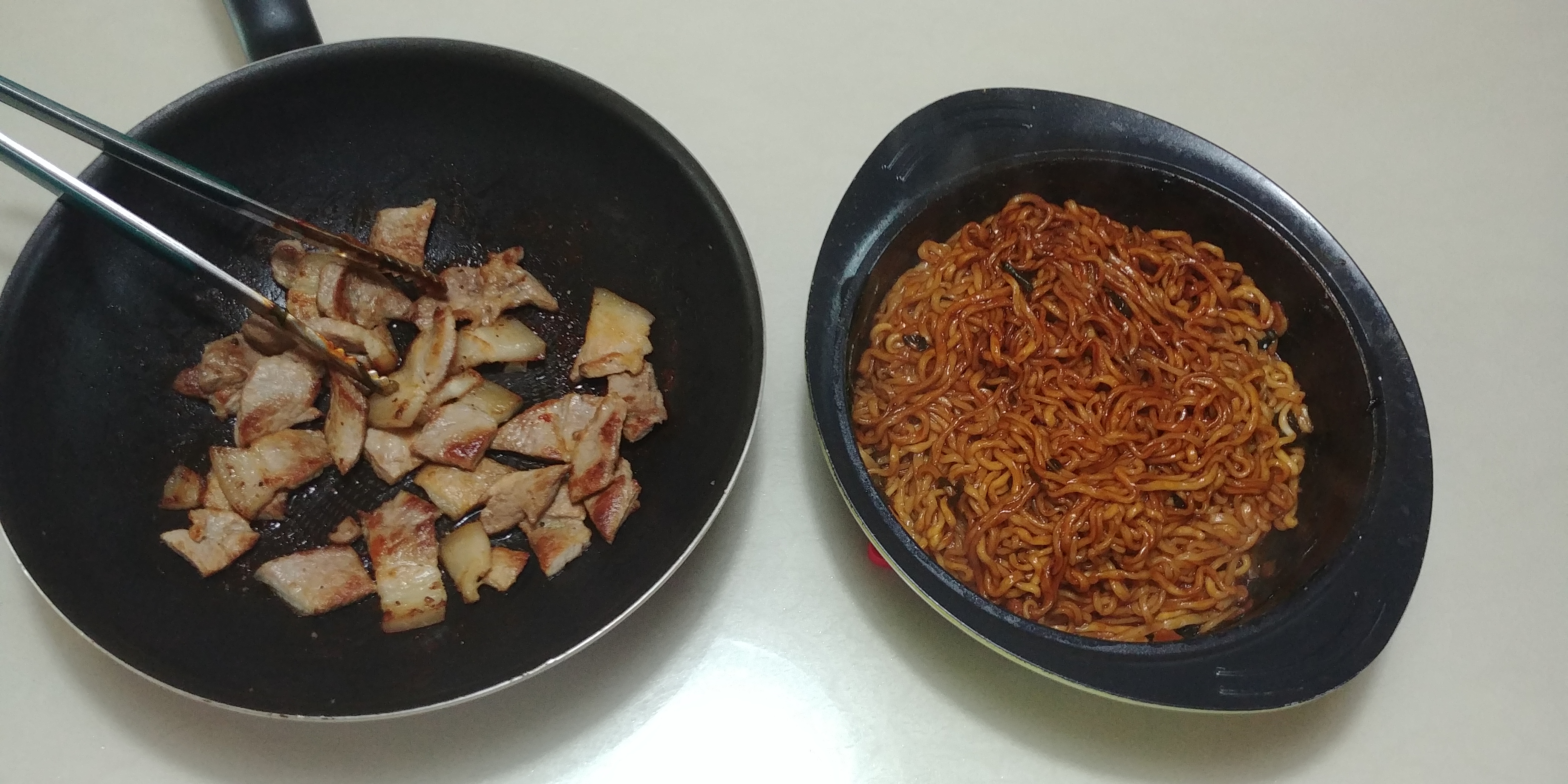 총 합쳐서 돼지고기 앞다리살 두 줄과 세 개의 라면을 먹었는데, 형이랑 둘이 다 먹었습니다. 비록 채끝살은 아니지만, 삼겹살에 비빔면 싸 먹듯이 먹으면 조합이 괜찮습니다. 불파구리나 짜파구리를 드시게 된다면, 고기와 같이 드시는 걸 추천드립니다.