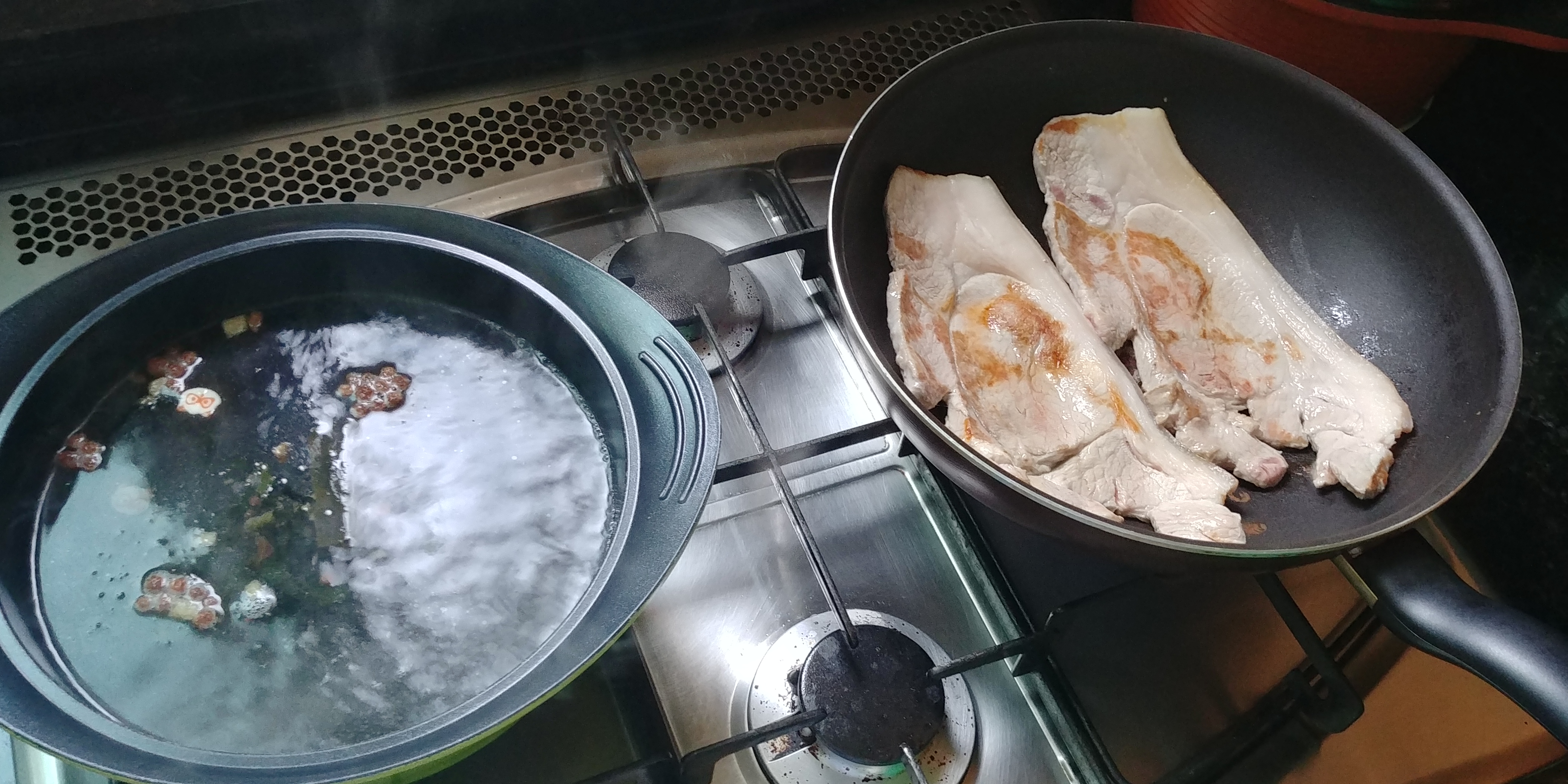 면이 익는 동안 심심하시면 고기를 잘라줍니다. 고기가 참 맛있어보입니다. 삼겹살 같지만, 저건 돼지고기 앞다리살입니다. 면이 다 익으면 물을 약 10스푼 정도만 남겨주시고 다 버려줍니다.