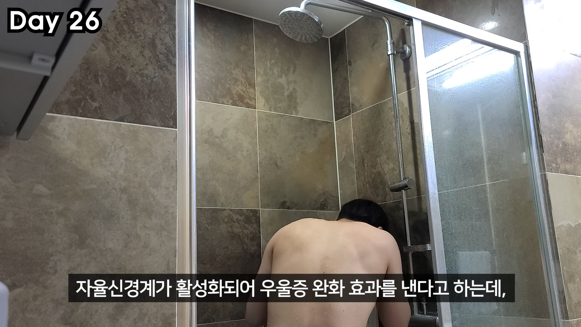 우울증이 달아날 정도로 물이 차갑기 때문에 찬물 샤워가 우울증 완화에 효과가 있을 것 같다는 생각이 듭니다.