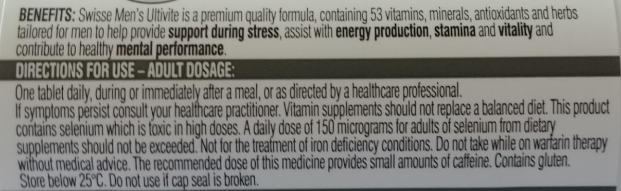성인 기준으로 하루에 한 알씩 식사 중이나 식 후 바로 드시라고 합니다. 그리고 셀레늄이라는 물질이 있어서 이걸 많이 먹으면 몸에 안 좋다고 하니 하루에 한 알 이상 드시지 말라고 합니다. 또한 warfarin(와파린)이라는 항혈전제를 복용하고 계신 분이라면, 반드시 의사와 상의한 후에 이 스위스 멀티비타민을 드시라고 합니다.