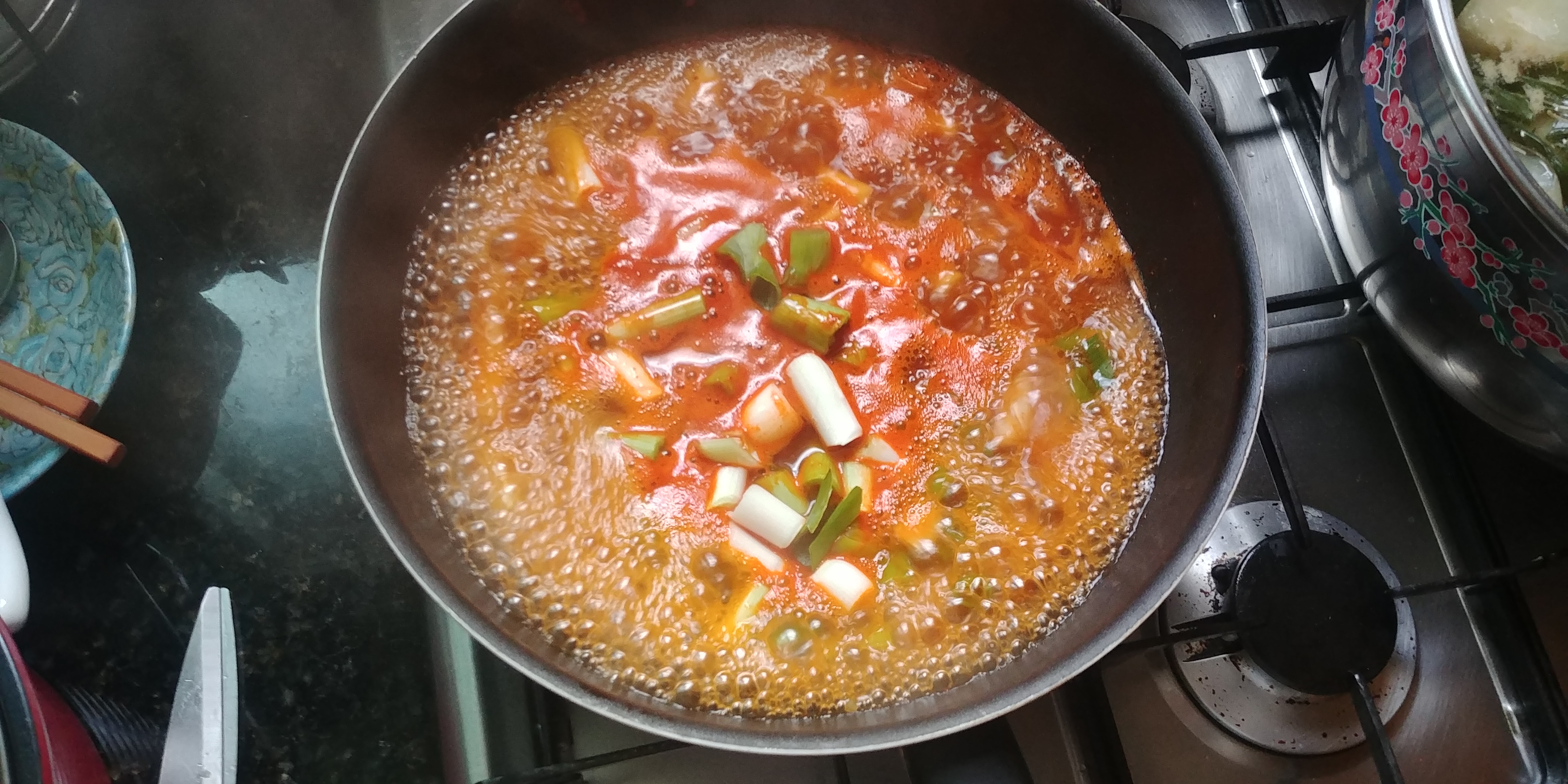 요렇게 치즈만 빼고 다 때려 박은 후에 끓여주시면 됩니다. 그런데 조리법 4번을 보시면, 기호에 따라 대파나 어묵, 계란 등을 추가로 넣어 드셔도 좋다고 나와있기 때문에 저는 대파를 잔뜩 넣어봤습니다. 백종원 선생님이 떡볶이는 대파라고 하셔서 잔뜩 넣었습니다.
