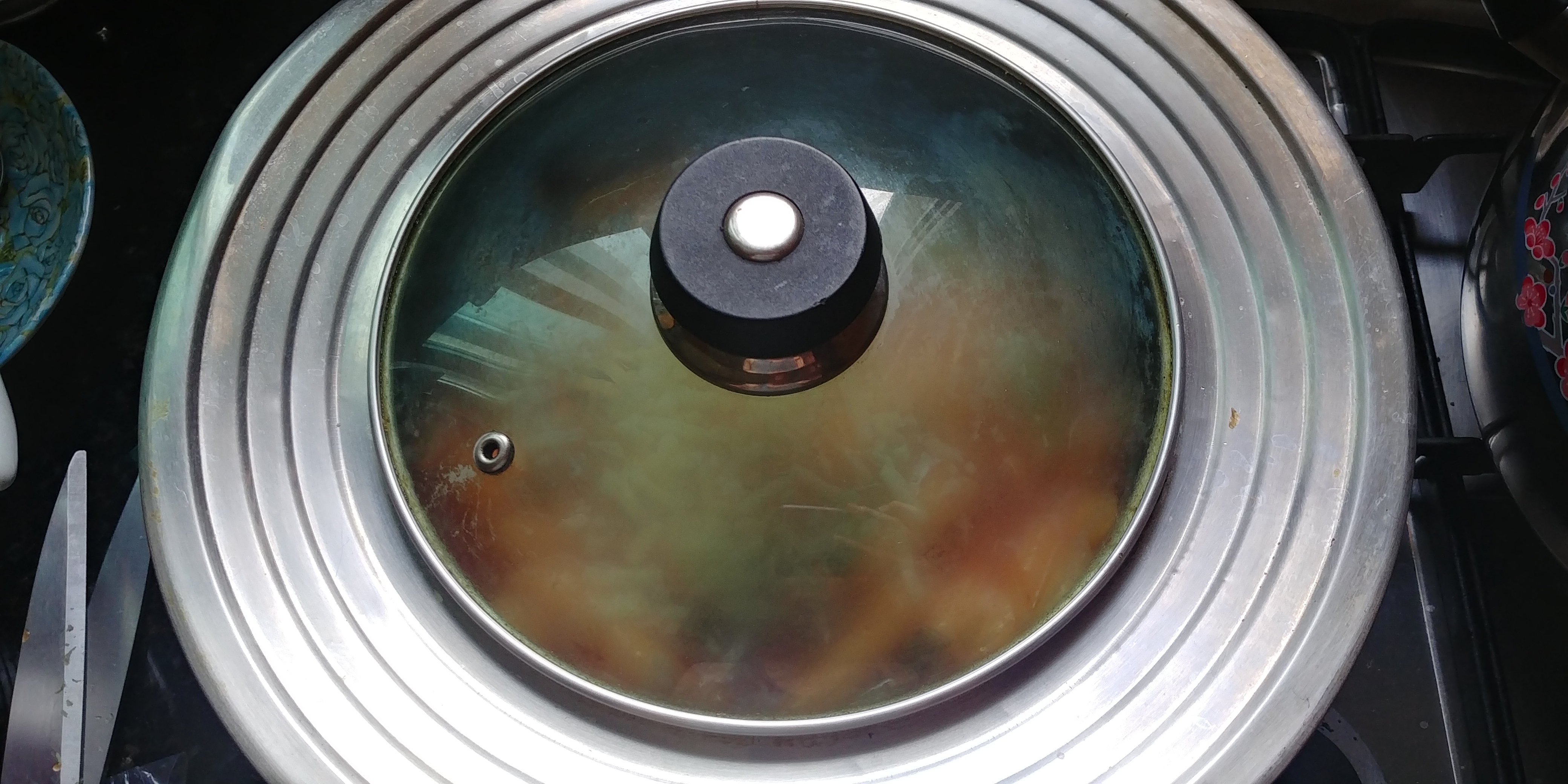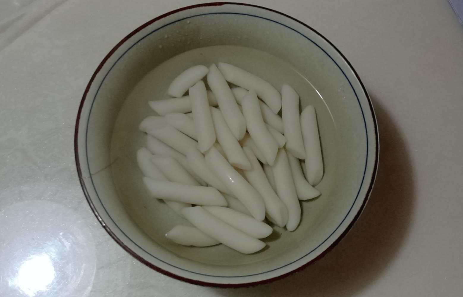 대충 흐르는 물에 씻어주신 뒤에 뜨거운 물을 요로코롬 부어줍니다. 저는 물을 커피포트에 끓여서 넣었는데, 해본 결과 펄펄 끓는 물을 넣어도 상관없는 것 같습니다. 그리고 30분 정도를 기다려줍니다. 물론 귀찮으시면 그냥 떡만 흐르는 물에 씻으시고 바로 다음 단계로 넘어가셔도 됩니다.