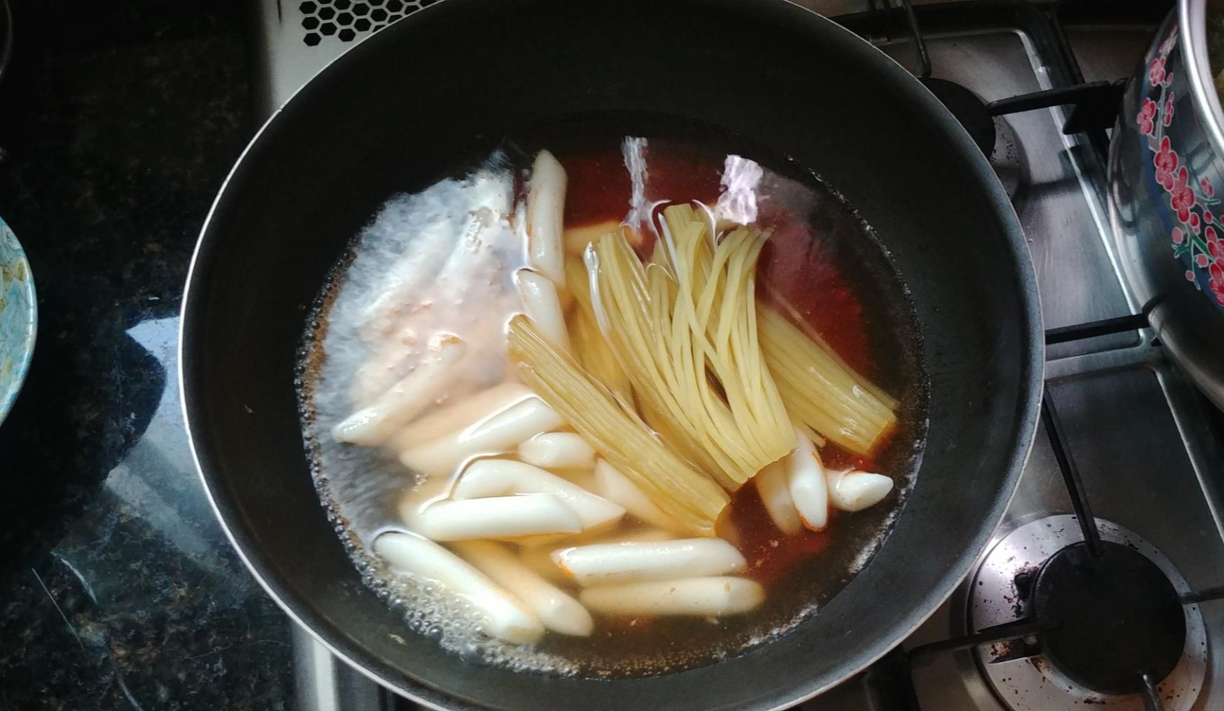 3. 소스가 팔팔 끓기 시작하면 3분~3분 30초간 가는 떡볶이 떡과 쫄면 사리가 눌어붙지 않도록 잘 저어주며 끓입니다.
