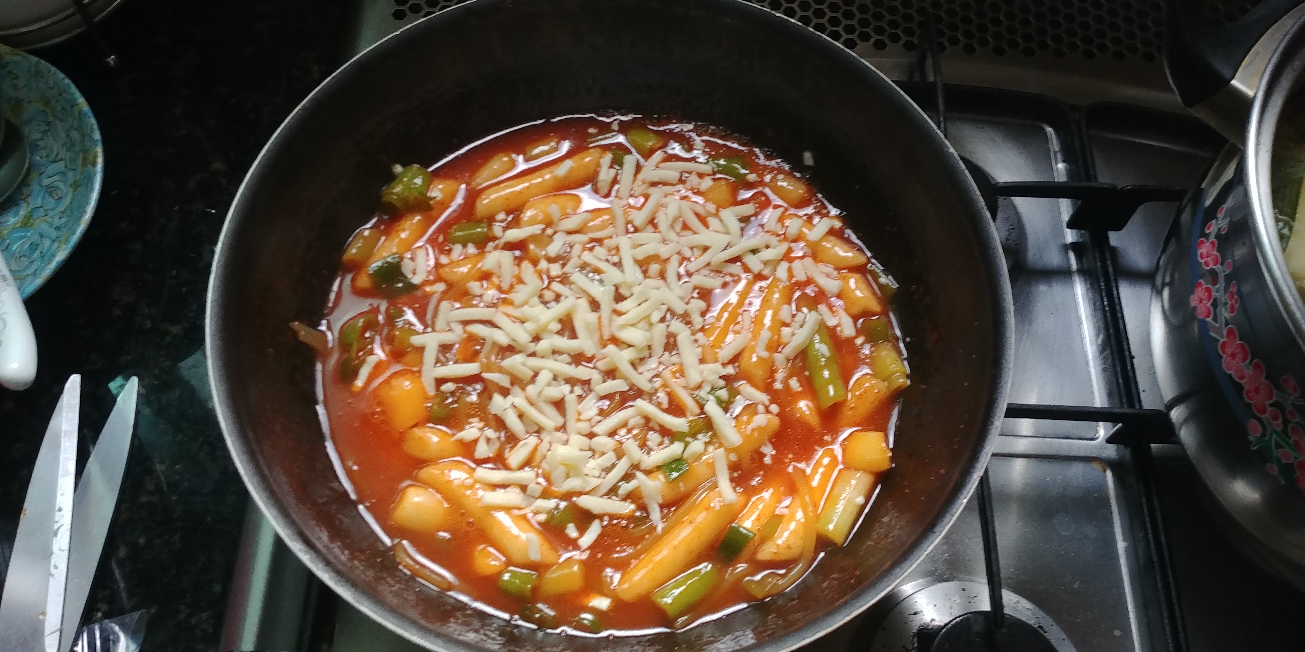 어느 정도 익었다 싶으면 요로코롬 치즈를 뿌리고 뚜껑을 닫아줍니다. 약 1분 정도 기다리면 다 녹는 것 같습니다. 그런데 생각보다 국물이 많아 보일 수도 있는데, 국물이 없게 드시고 싶으신 분들은 불을 켜시고 계속 떡볶이를 졸여주시면 됩니다.