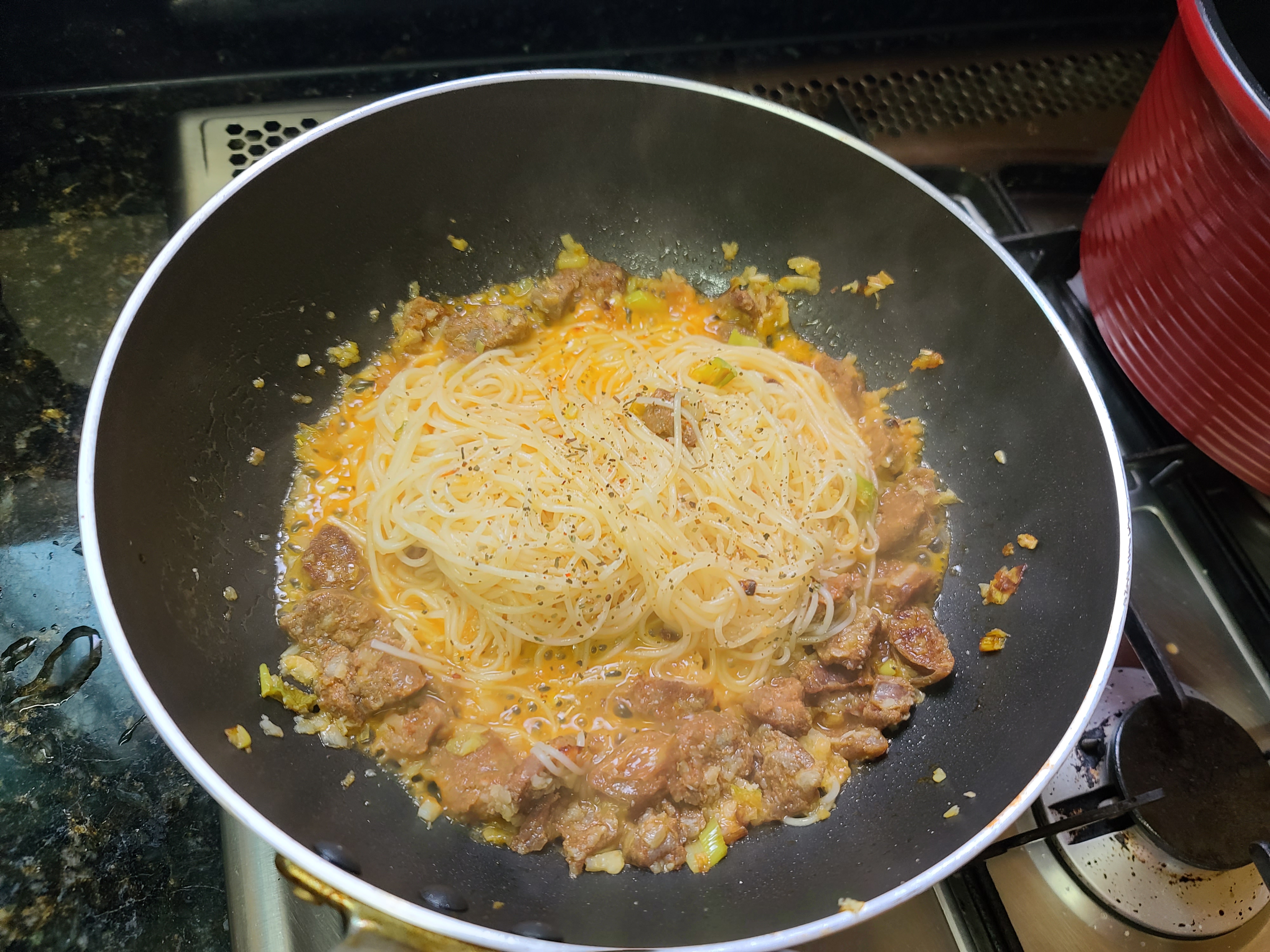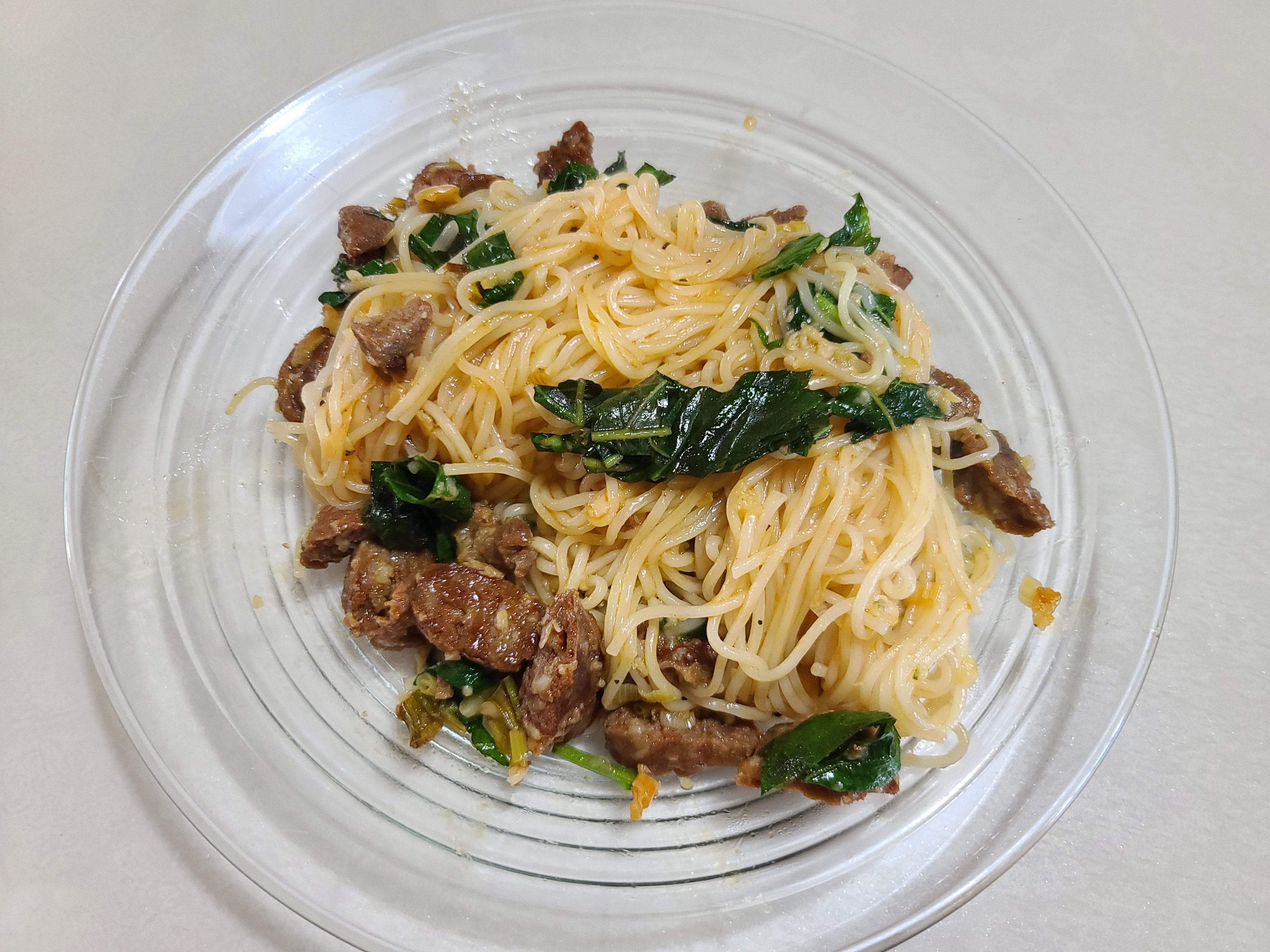 이제 초리조 파스타가 다 완성되었습니다.