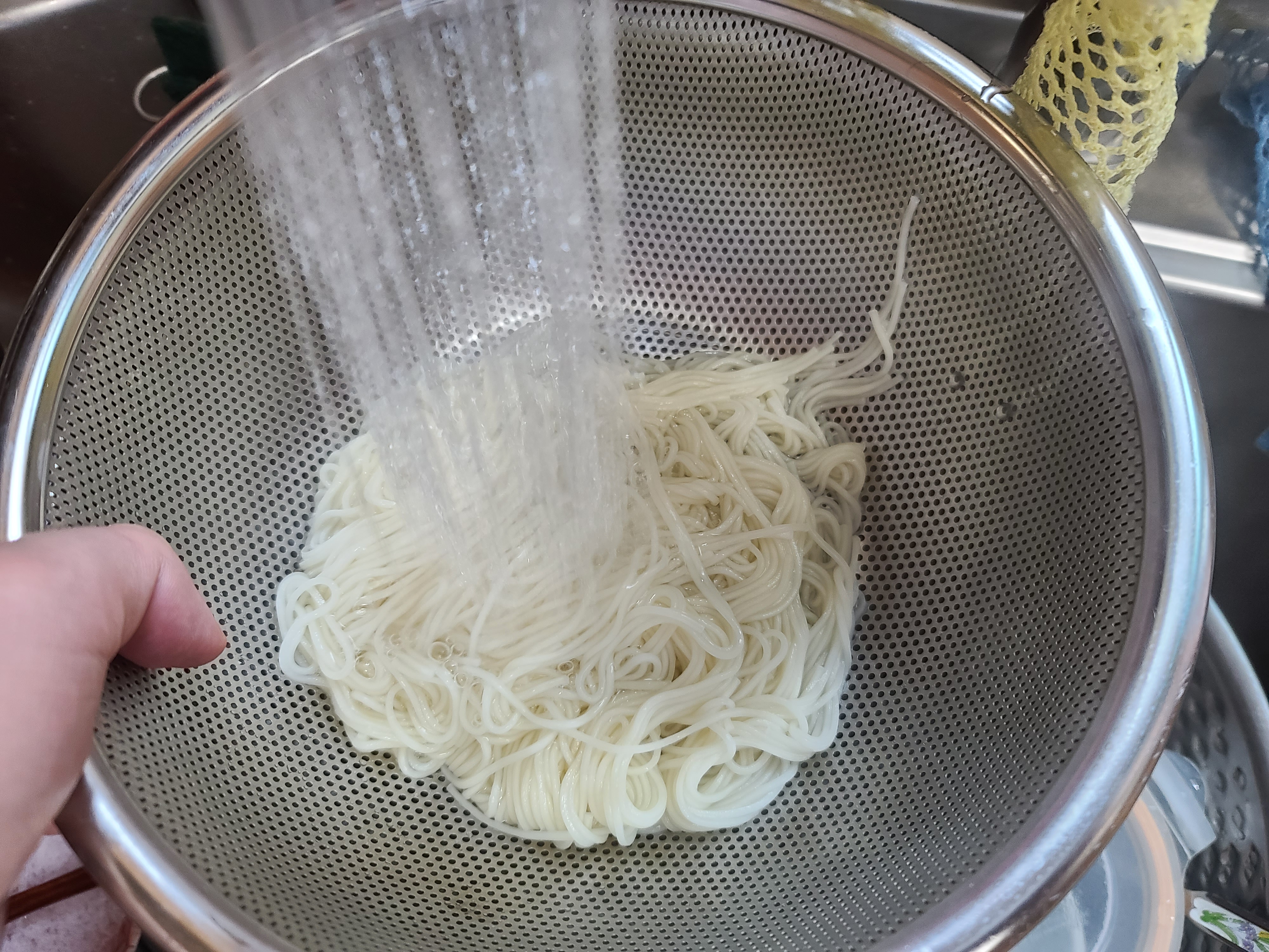 확실히 소면이다 보니 찬물로 헹구지 않으면 면발이 서로 늘러 붙을 것 같아서 찬 물로 한번 헹궈줬습니다.