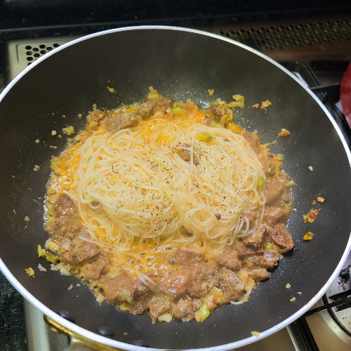 원래는 파스타 면으로 하려고 했는데, 오늘은 왠지 얇은 면이 당겨서 소면으로 파스타를 만들어봤습니다.