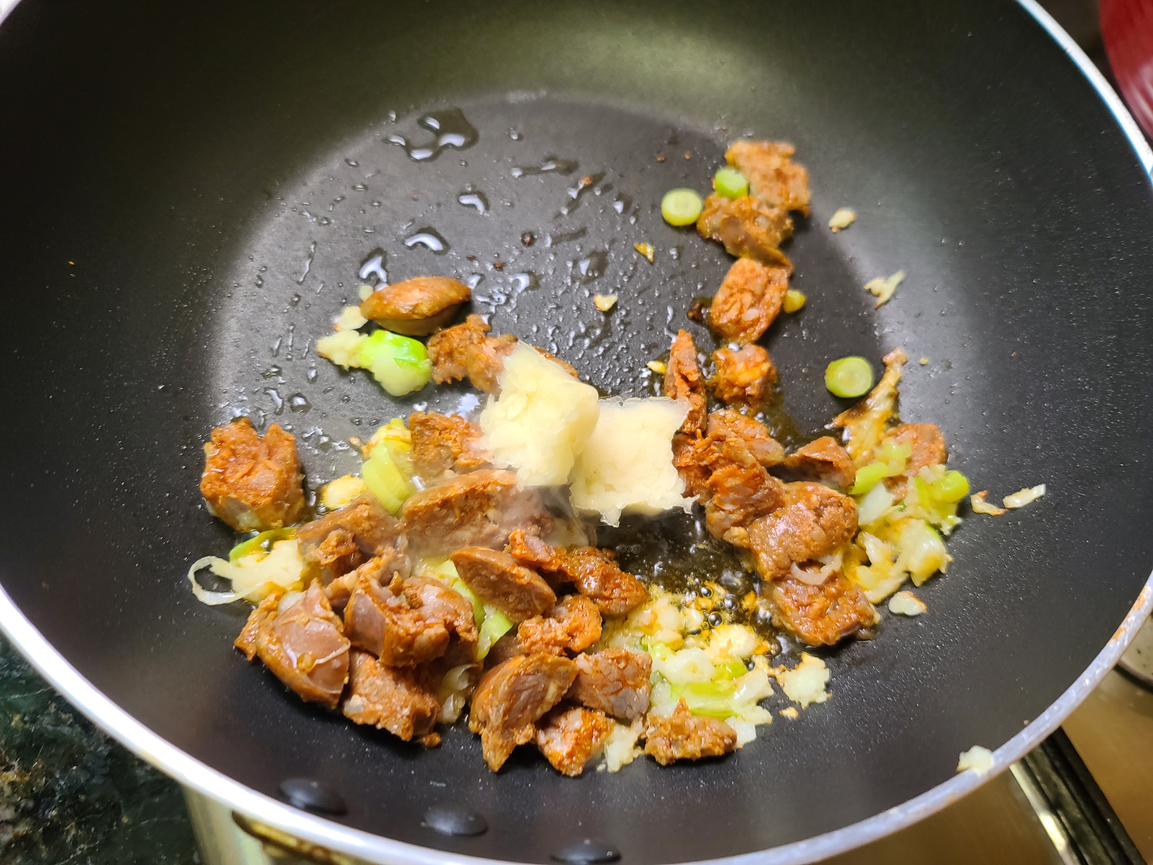 대파와 다진 마늘이 노릇노릇하게 익었으면 손질한 초리조를 넣어줍니다.