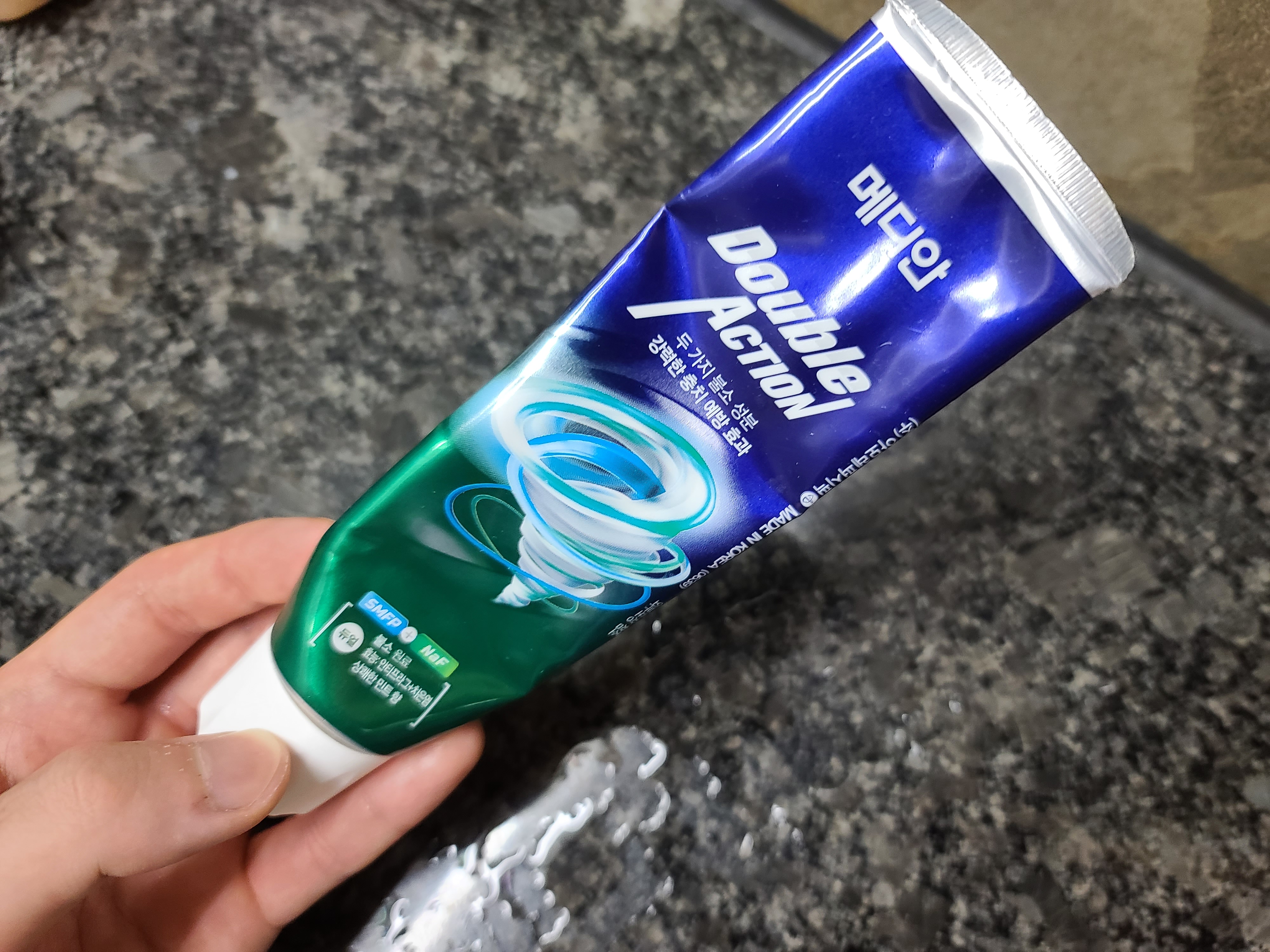 이렇게 하면 칫솔에 올린 고체 치약이 떨어질 수도 있어서 저는 그냥 전자의 방식으로 양치질을 합니다.