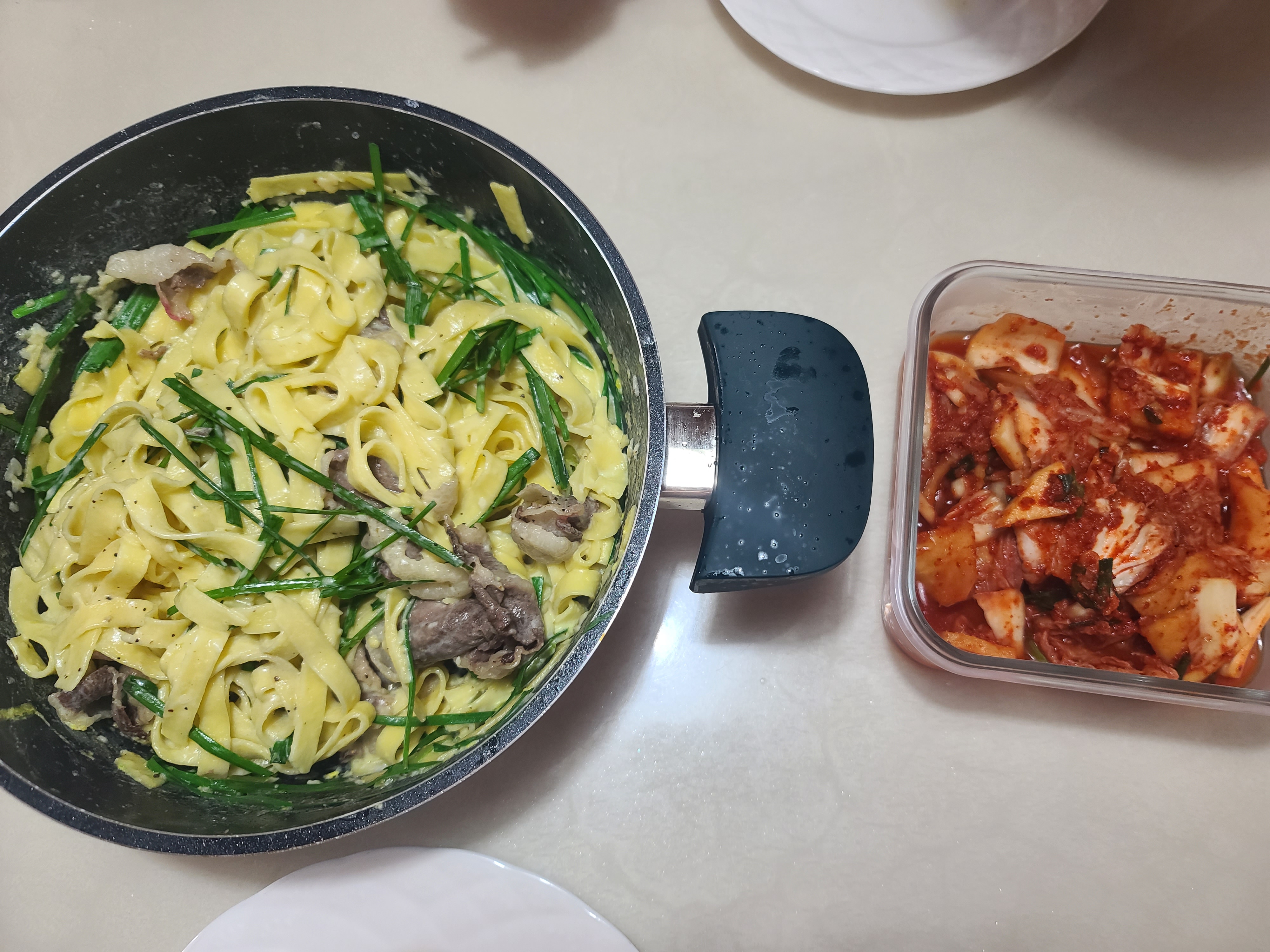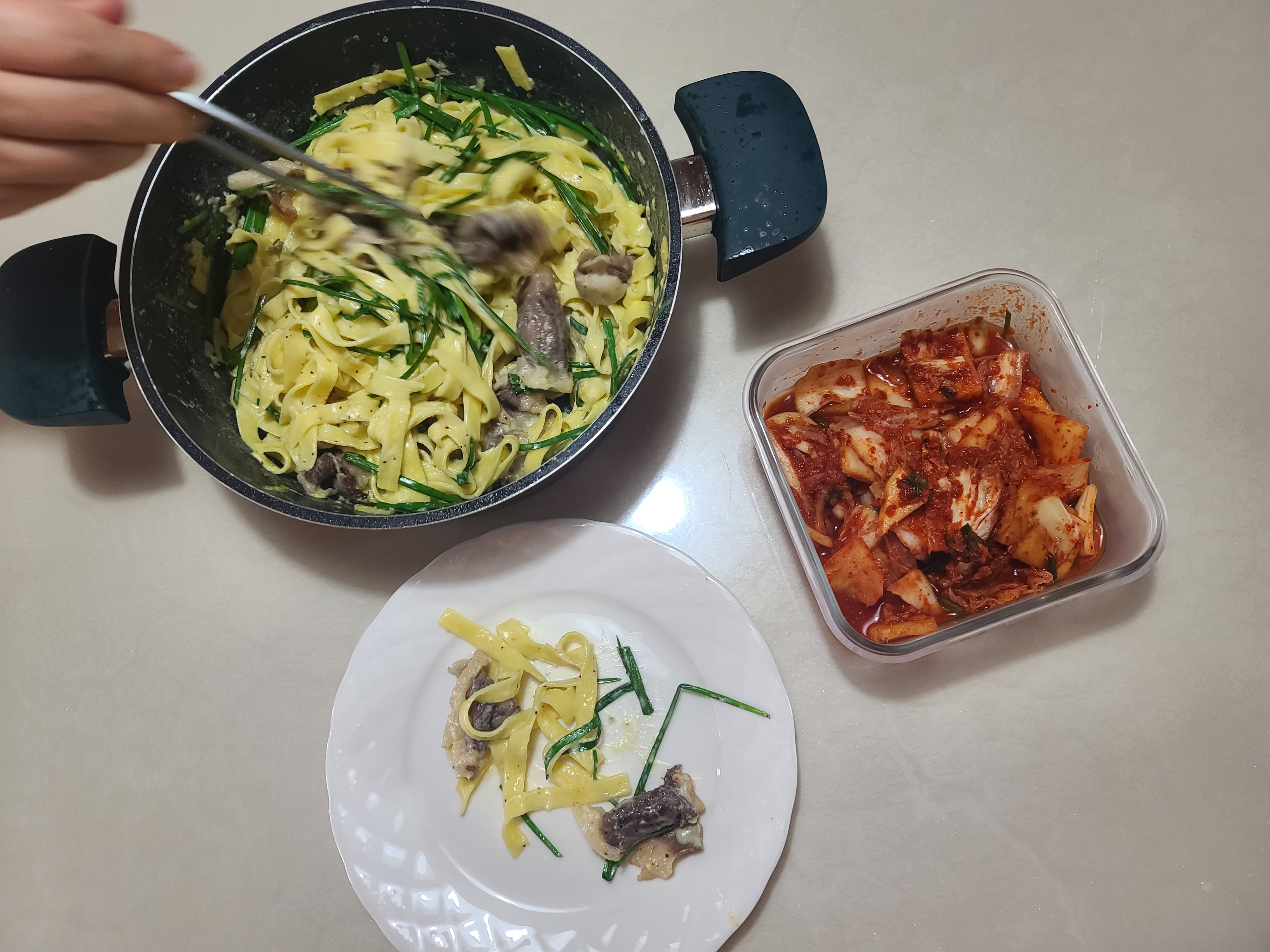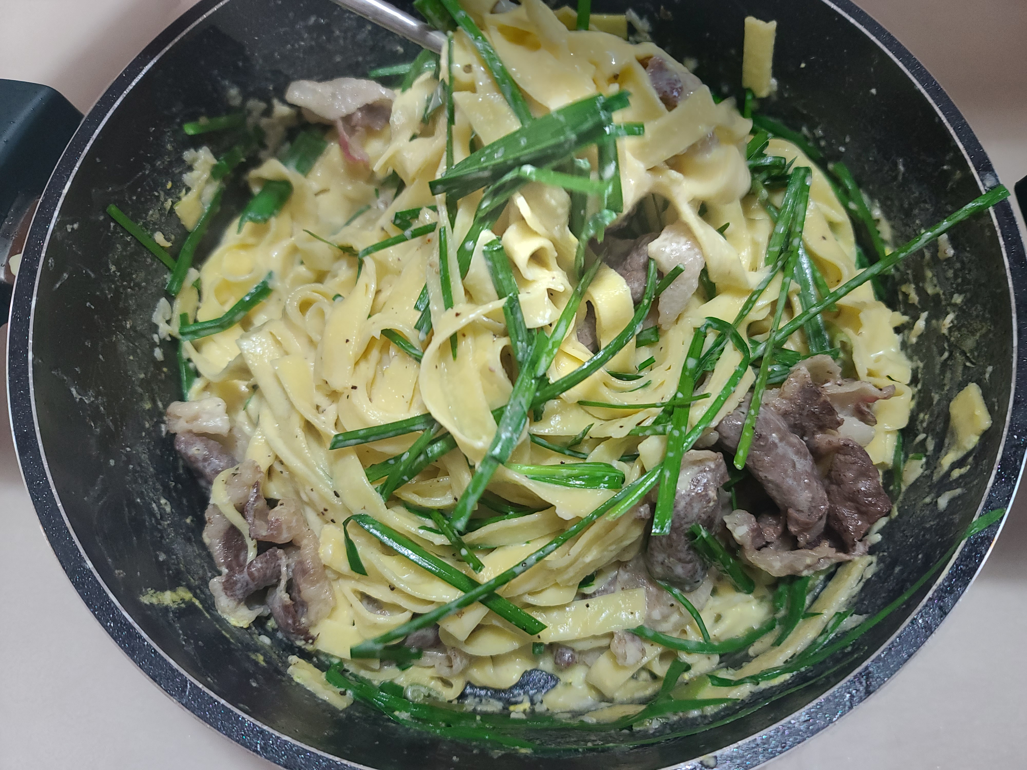 에그파스타에 우유와 치즈, 그리고 차돌박이를 넣어서 엄청 느끼할 줄 알았는데,