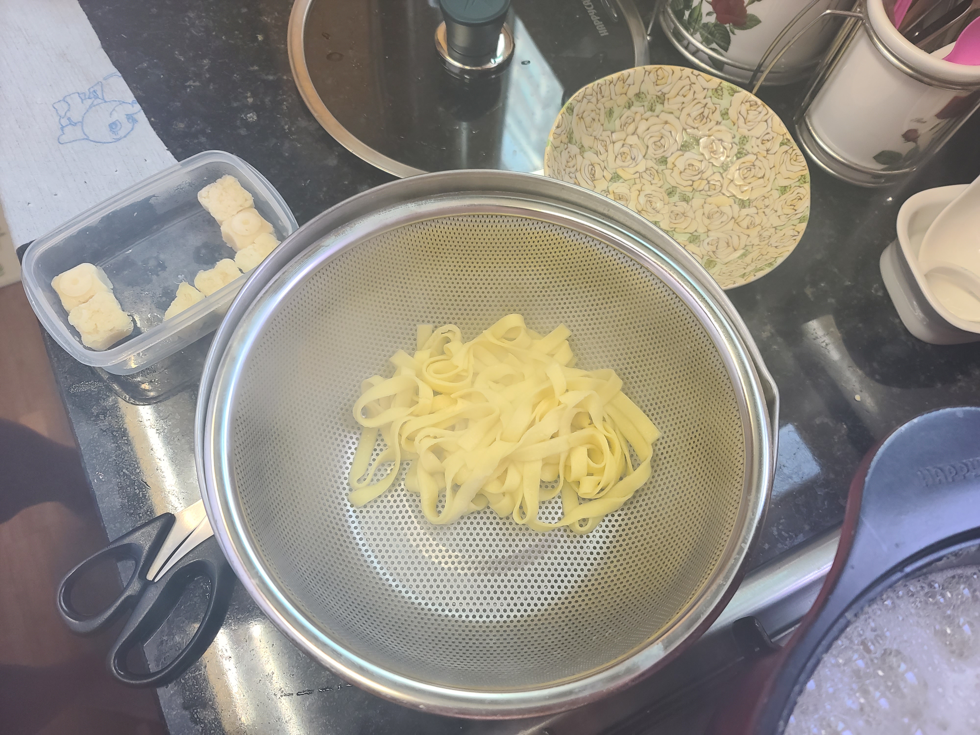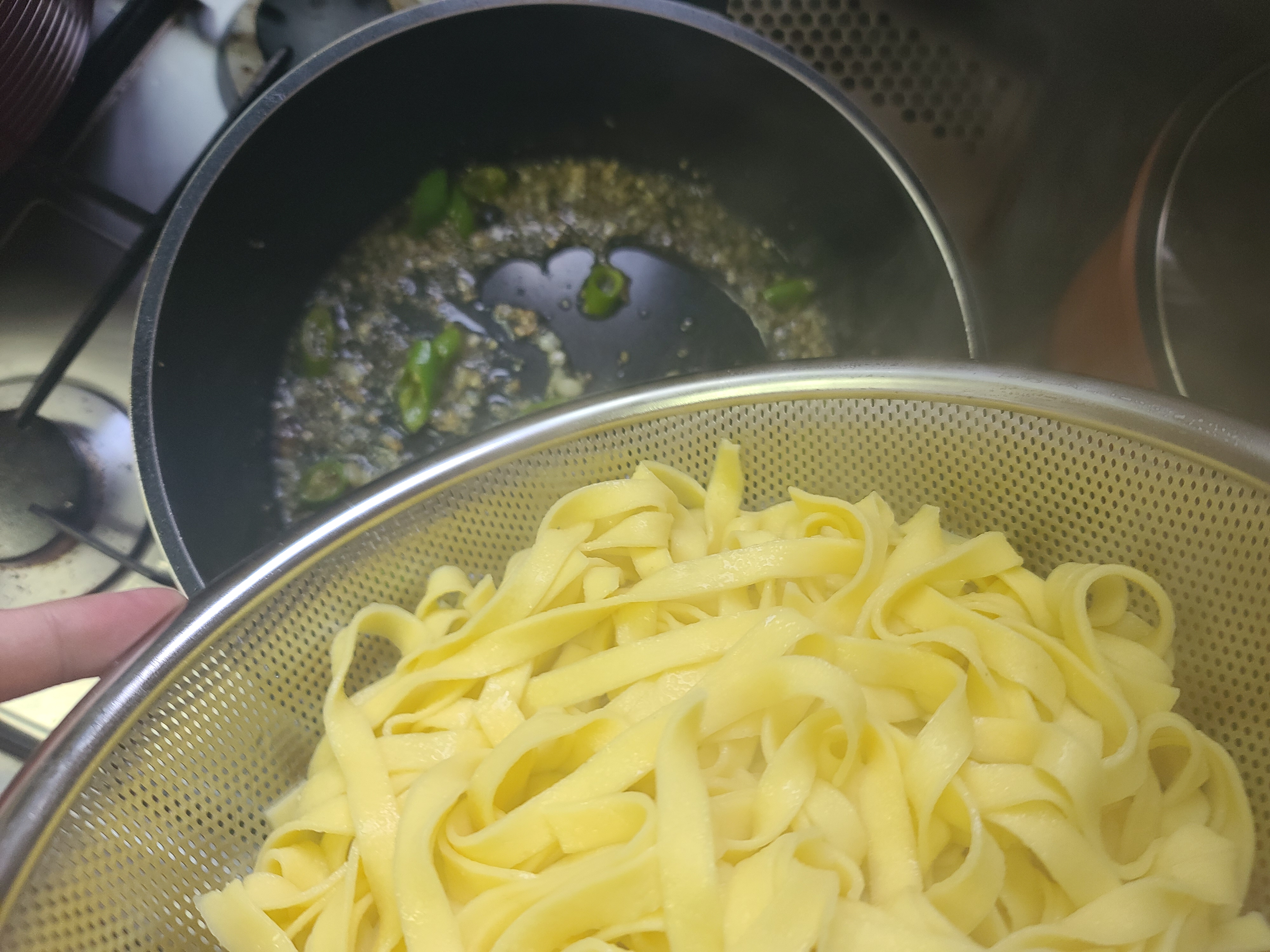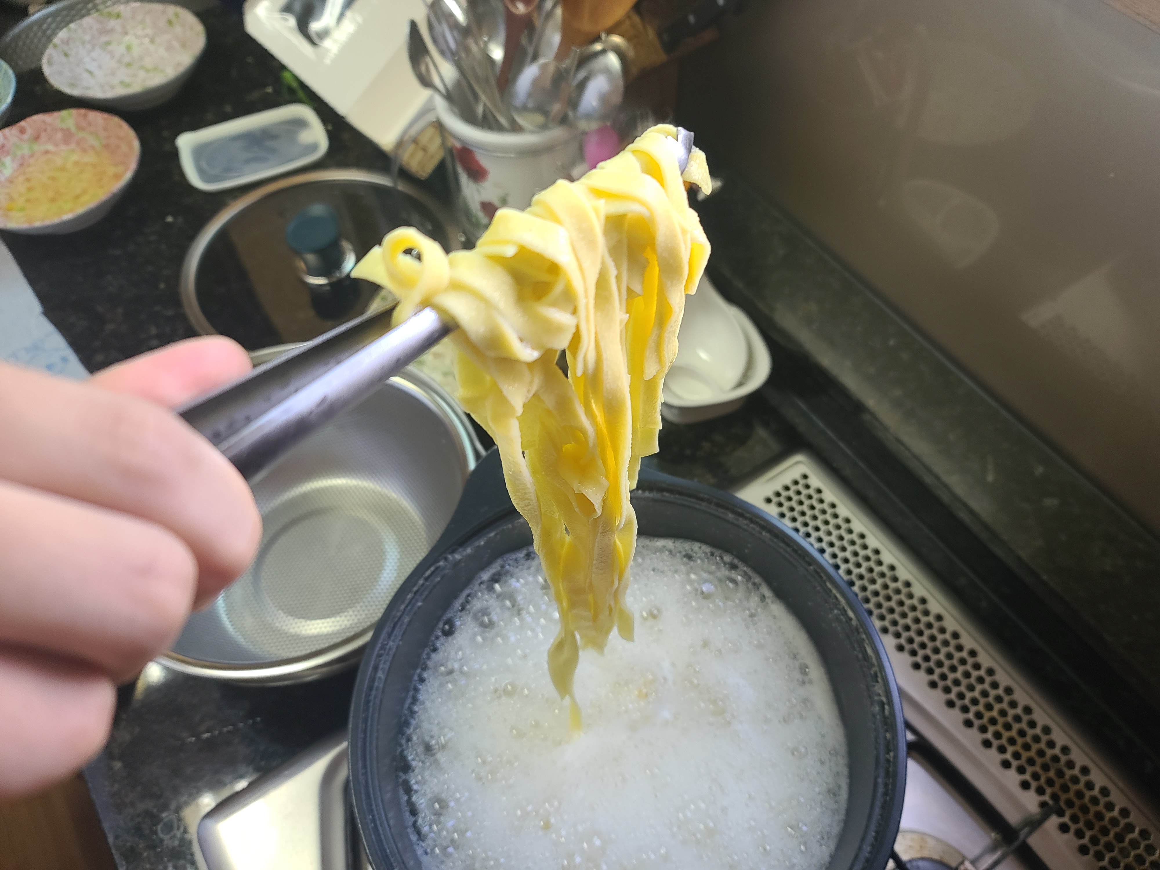 에그파스타(딸리아뗄레)가 다 익었다면, 면을 건져줍니다.
