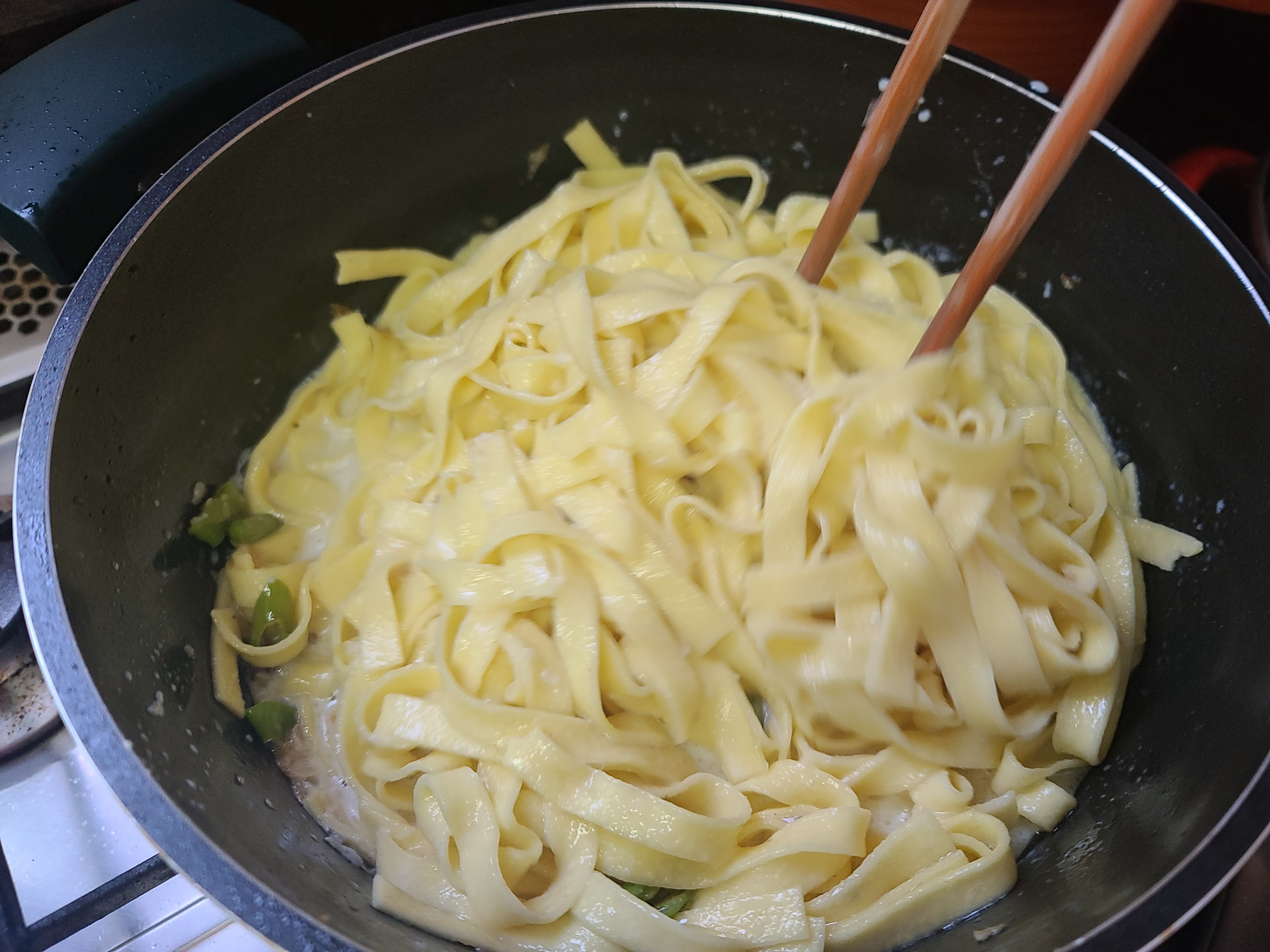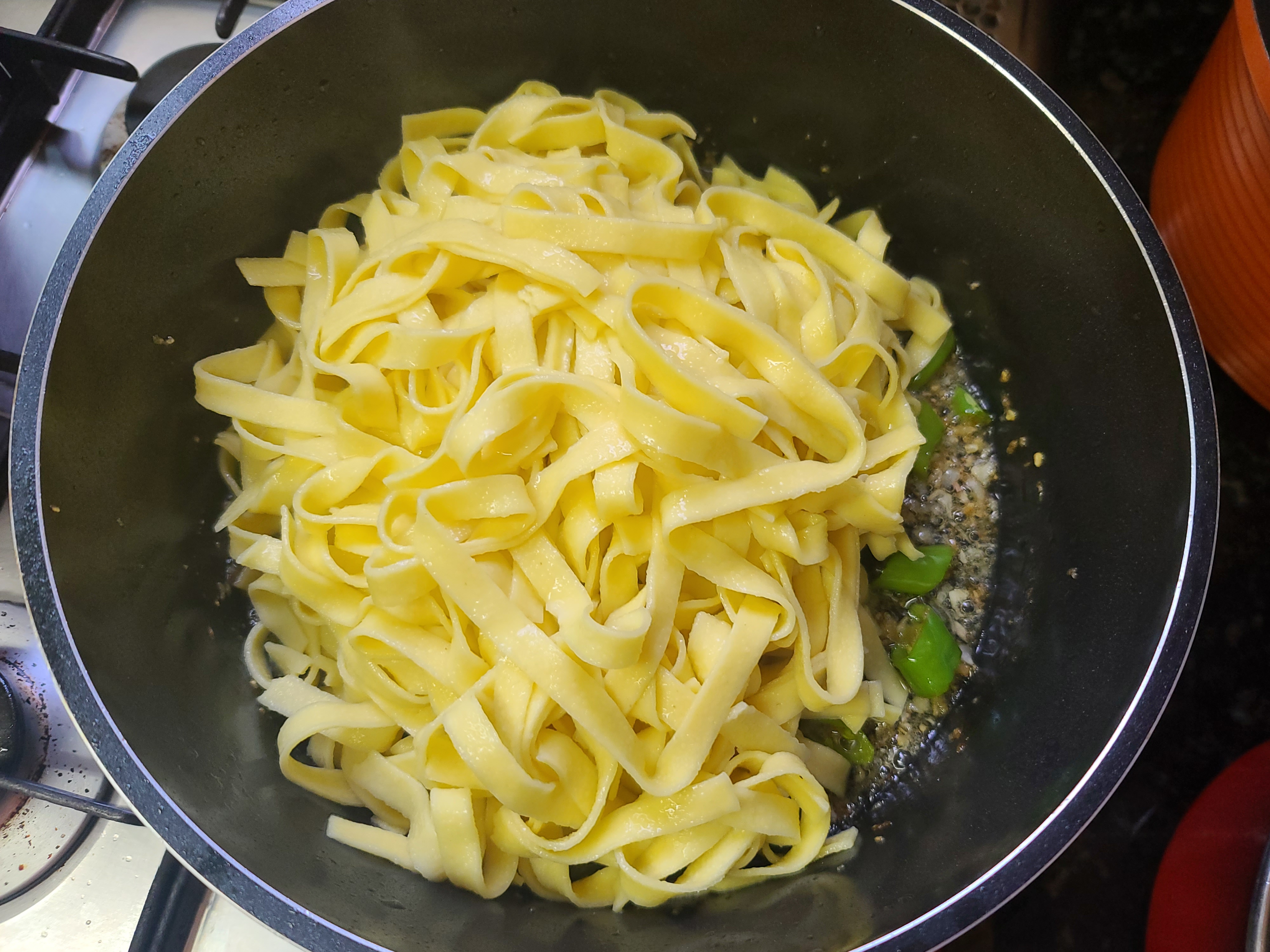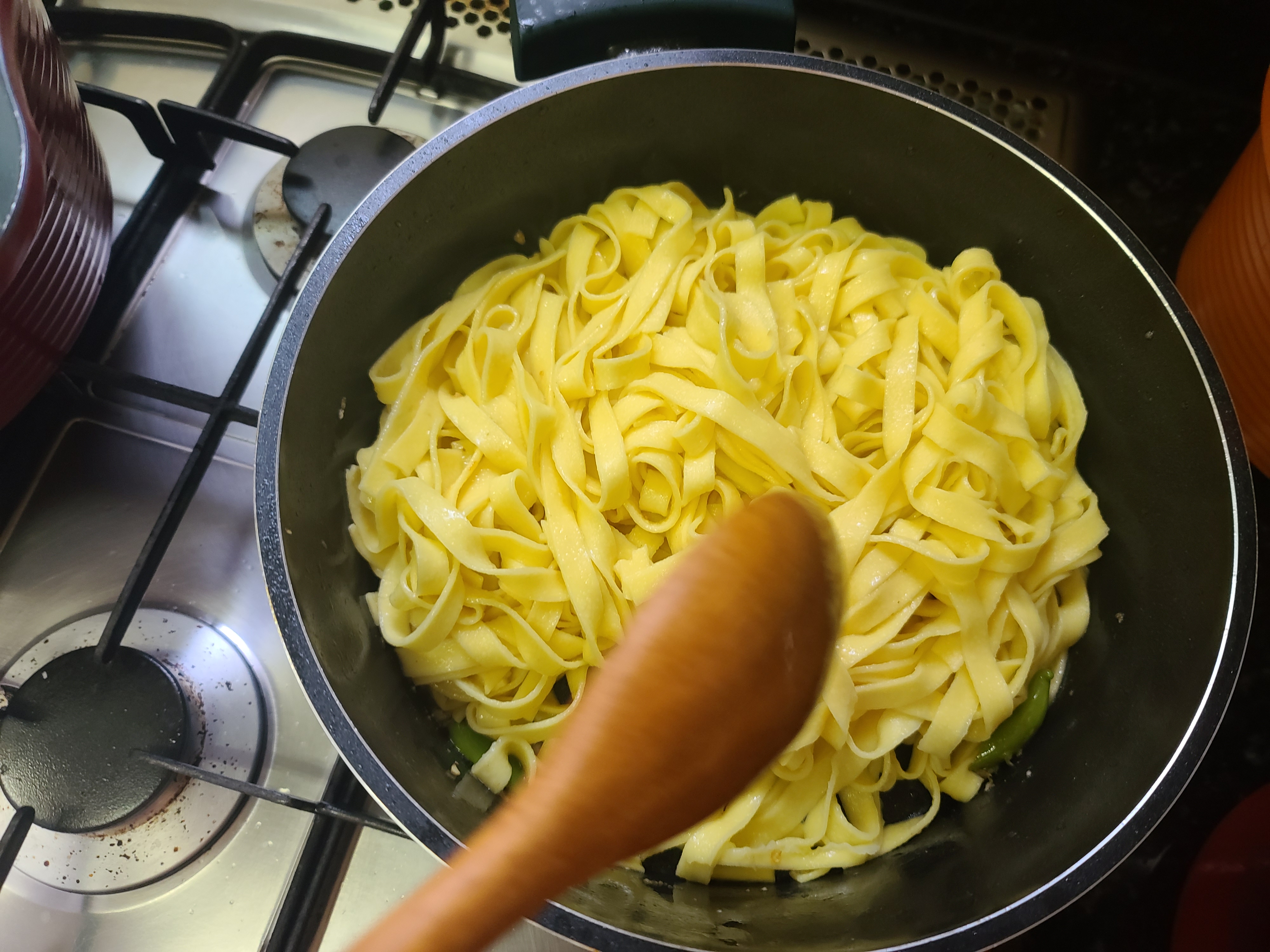 에그파스타(딸리아뗄레)가 다 익었다면, 면을 건져줍니다.