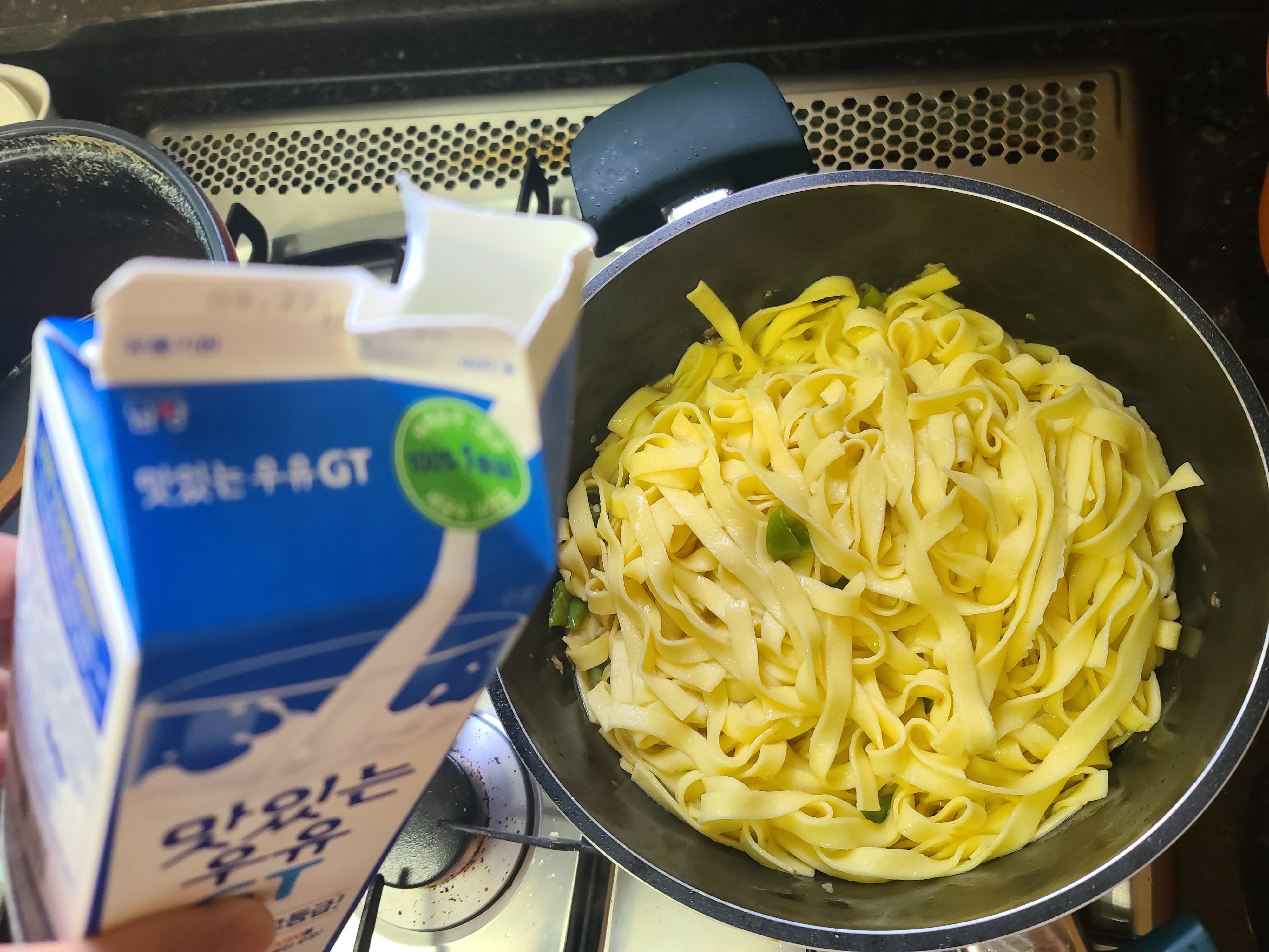 우유를 넣은 후 파스타를 대충 뒤적여주신 후,