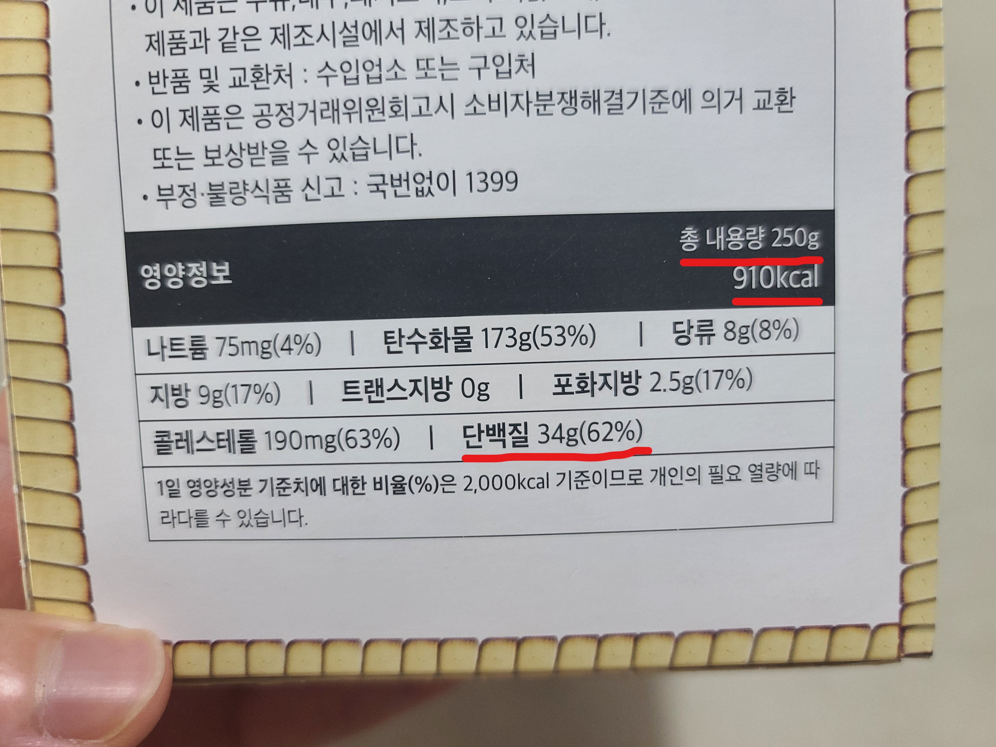 하지만, 그만큼 칼로리도 250g에 910kcal로 높습니다.