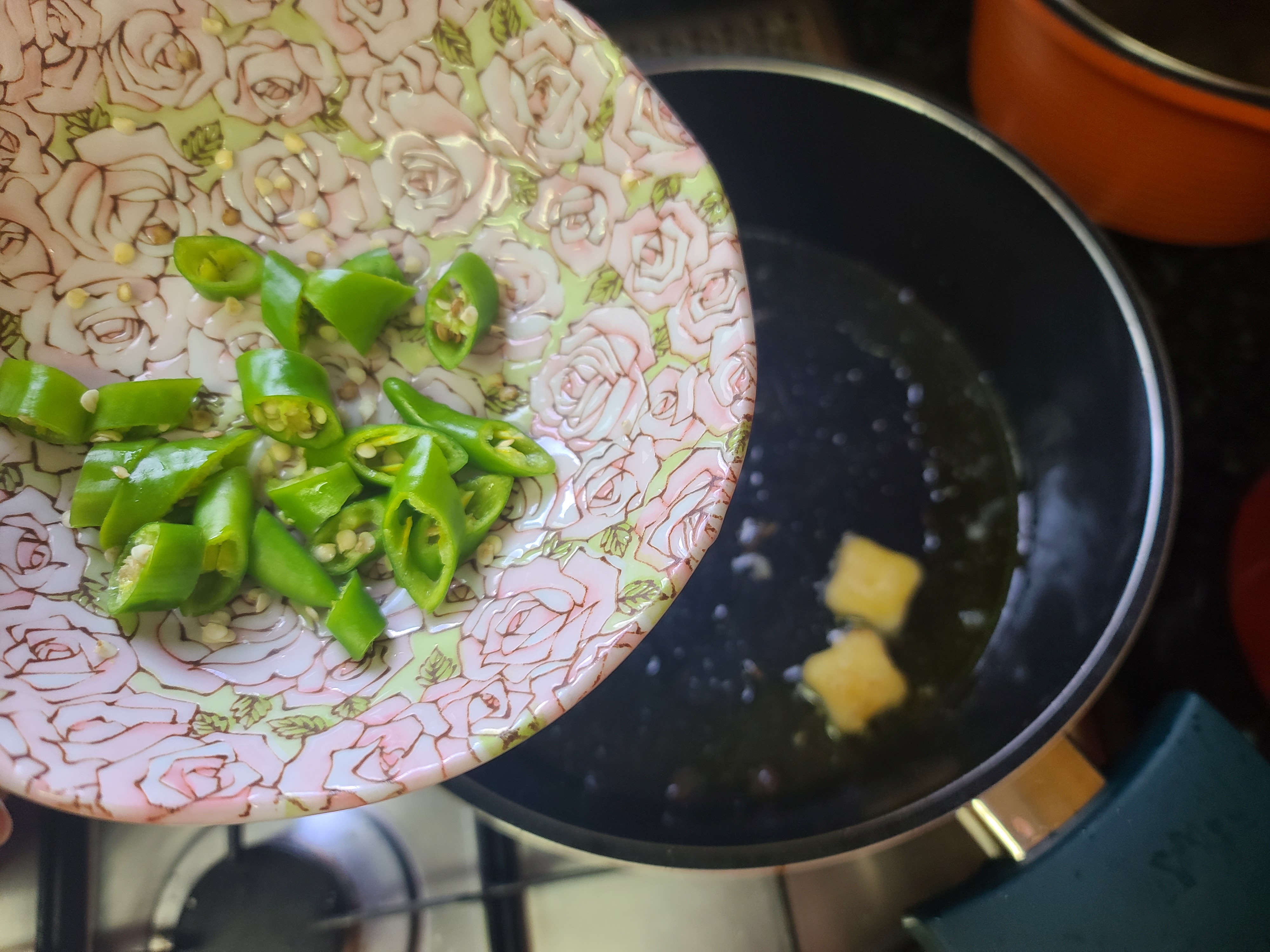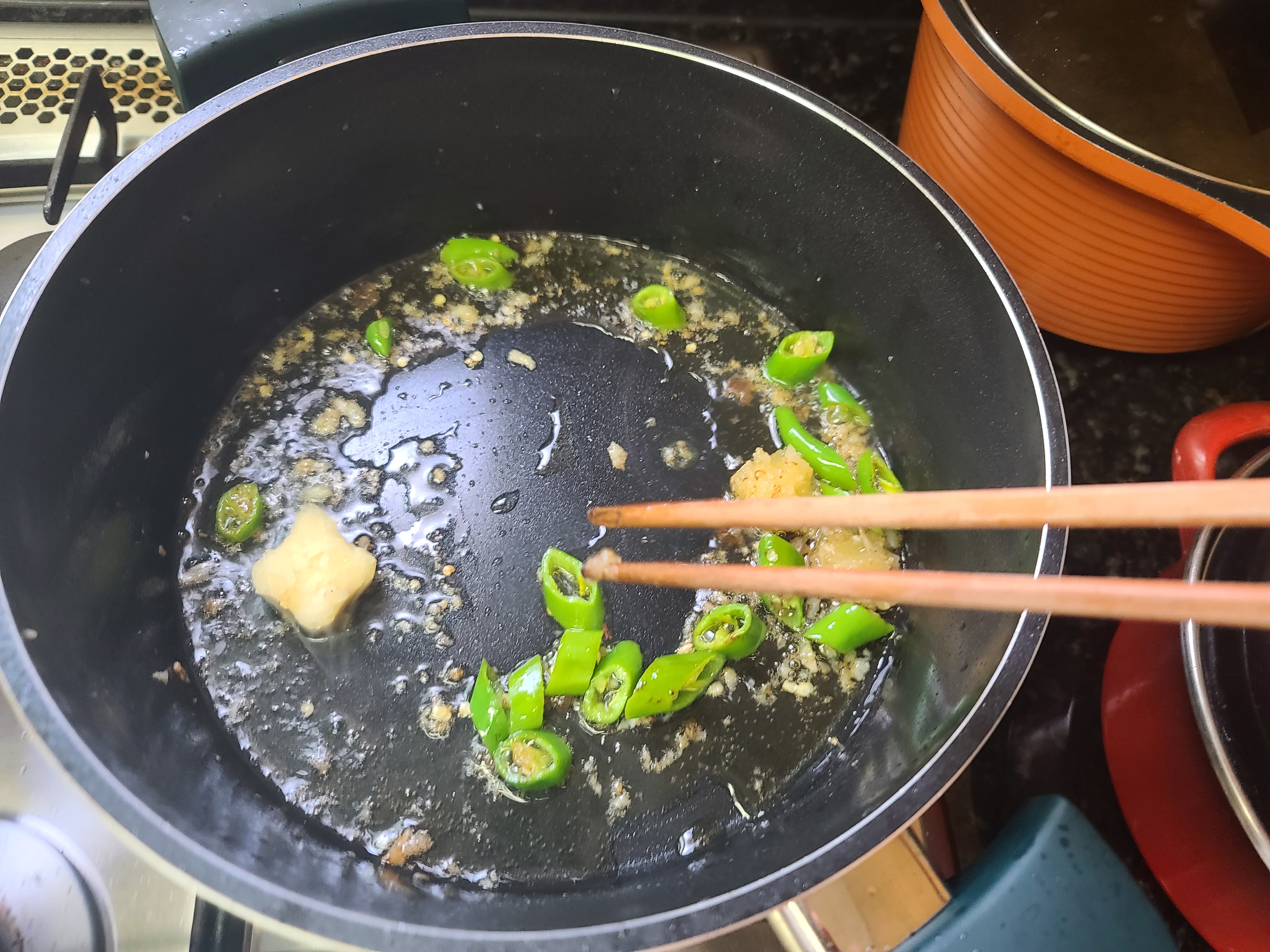 저는 매운 고추 3개와 다진마늘 큐브 3개를 넣었습니다.