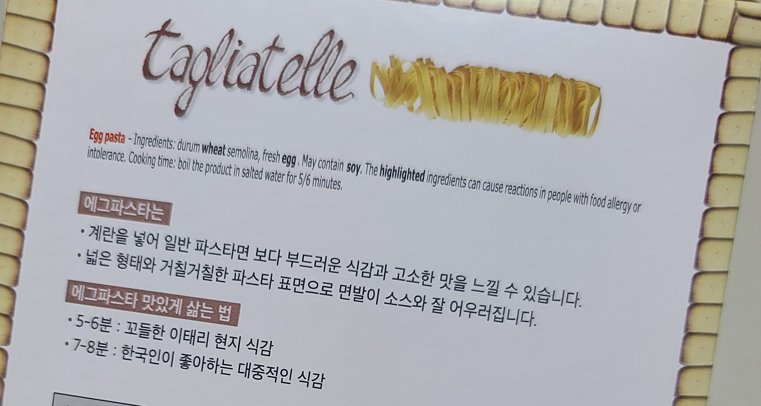그럼 다음으로 노브랜드 에그파스타(딸리아뗄레)는 어떻게 구성되어있는지 살펴보도록 하겠습니다.