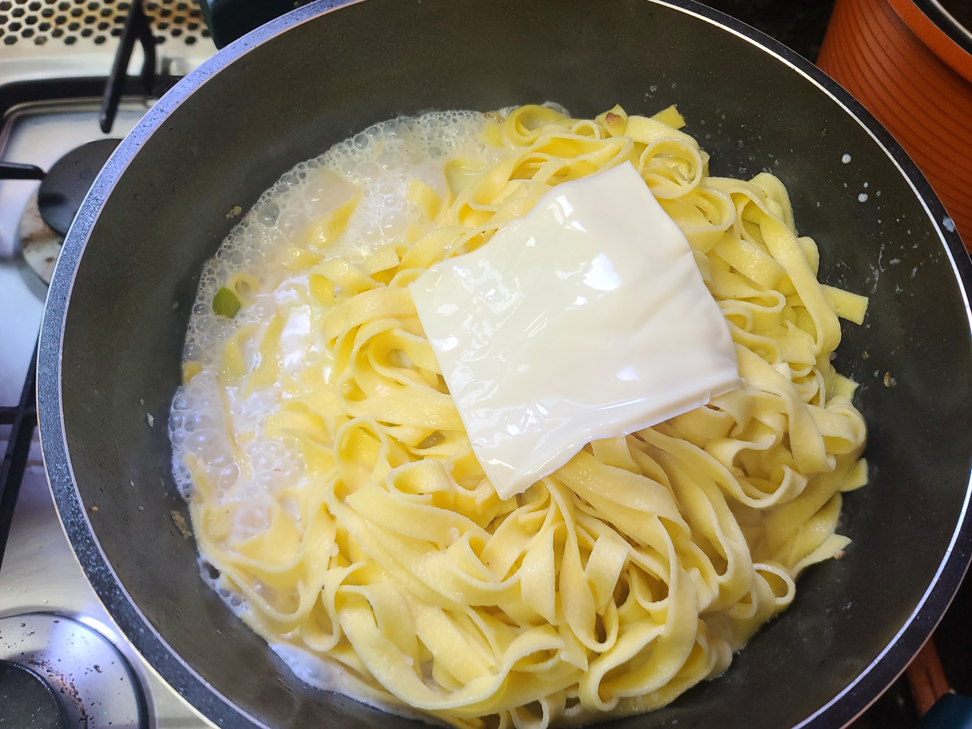 이번에는 생크림, 그리고 파마산 치즈가루가 없고 슬라이스 치즈도 한 장 밖에 없어서 우유를 조금만 넣었습니다.