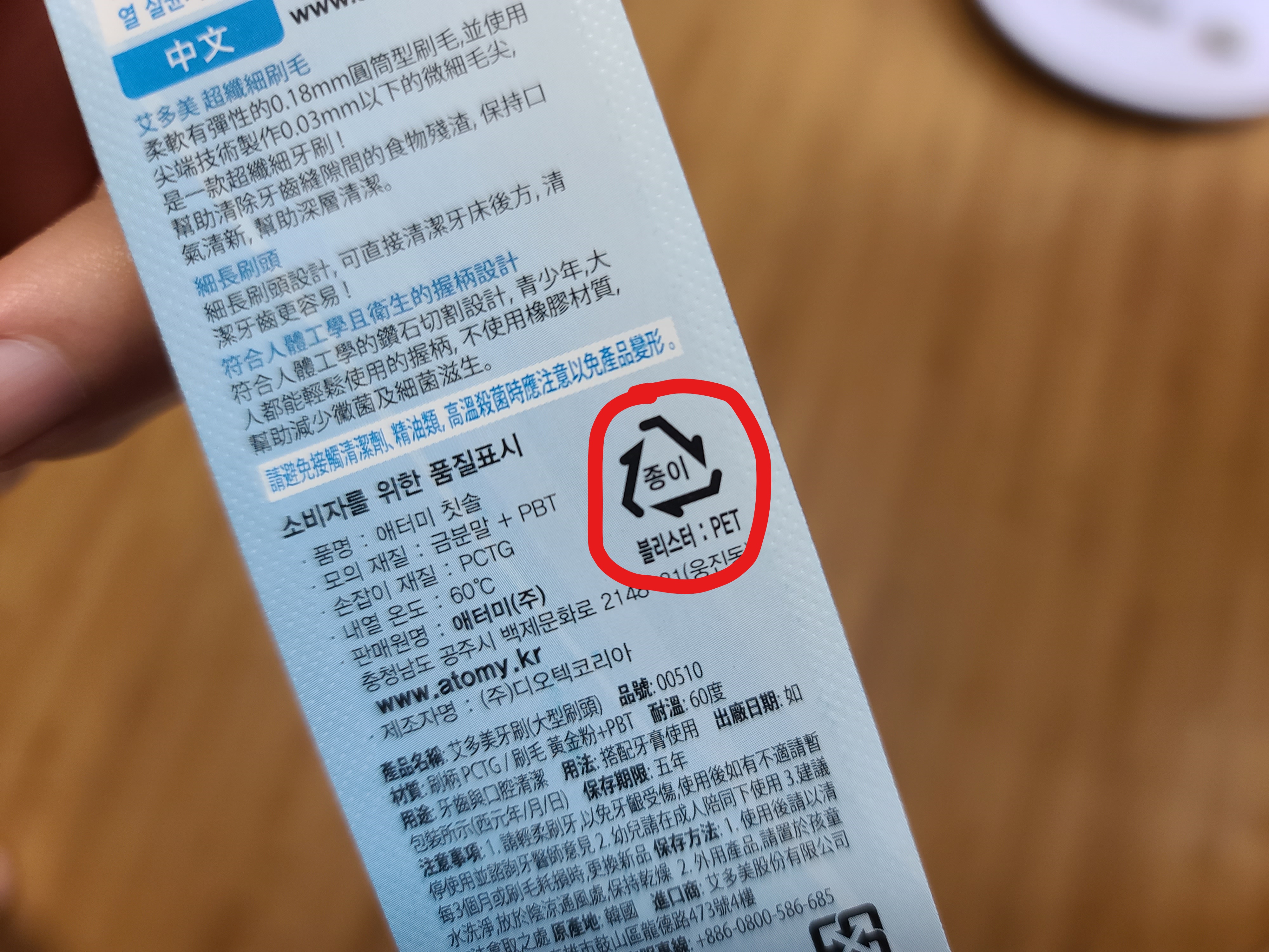 자세히 보니 칫솔을 감싸고 있는 포장지의 재질이 표시된 것이었습니다.