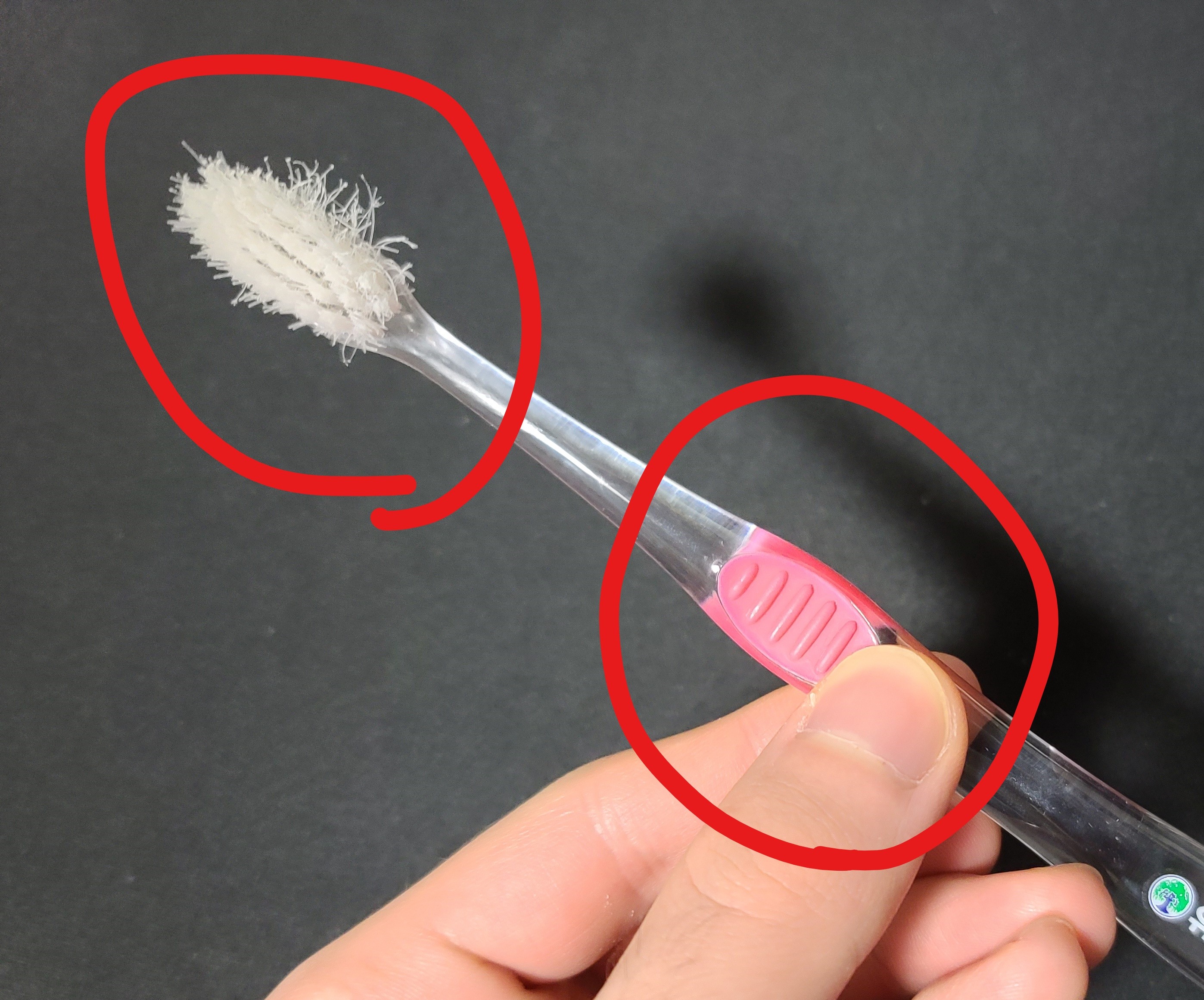 3개월간 이를 닦는데 쓰여진쓰인 후, 화장실 청소를 하는데 오랜 기간 쓰인 칫솔입니다.