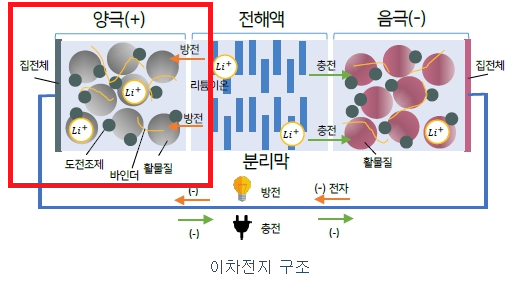 위 이차전지 배터리 구조 사진의 왼쪽 빨간색 네모 표시를 보시면 양극(+)라고 쓰여있는 것을 알 수 있는데,