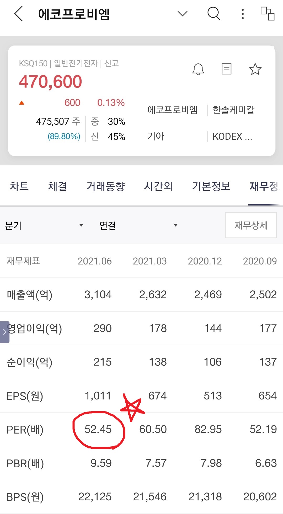 2021년 2분기를 기준으로 봤을 때 에코프로비엠의 PER은 무려 52배입니다.