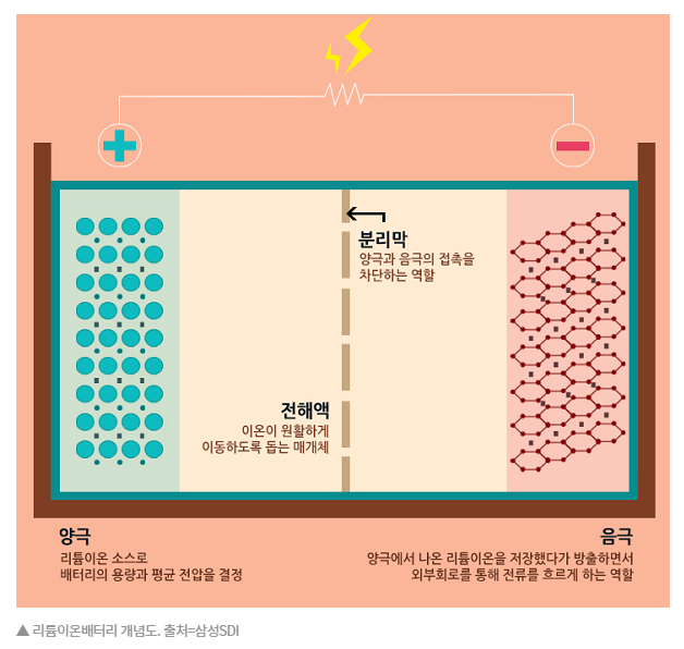 음극재에 있던 전자가 다시 양극재로 이동하면서 전기를 발생시킨다.