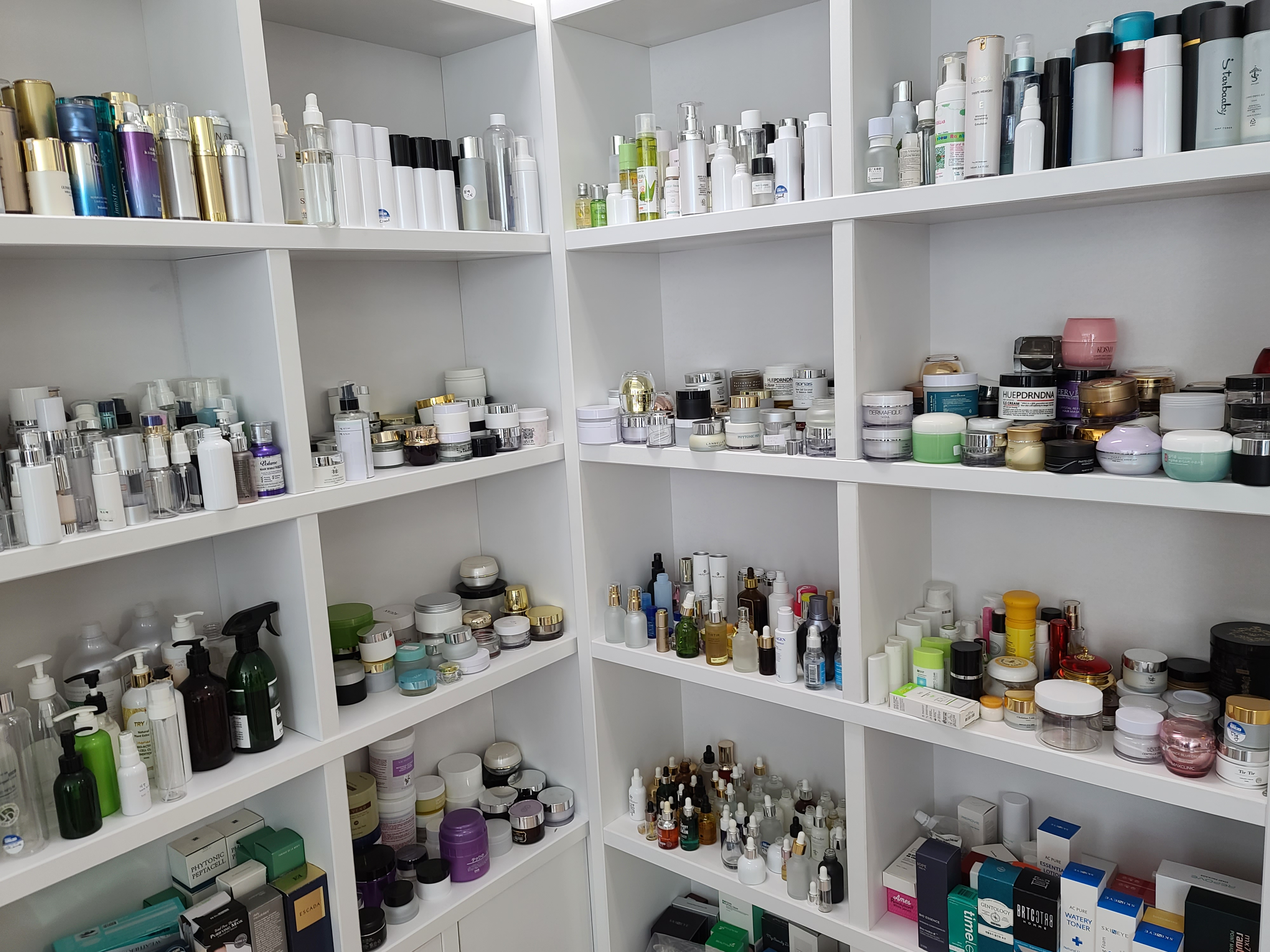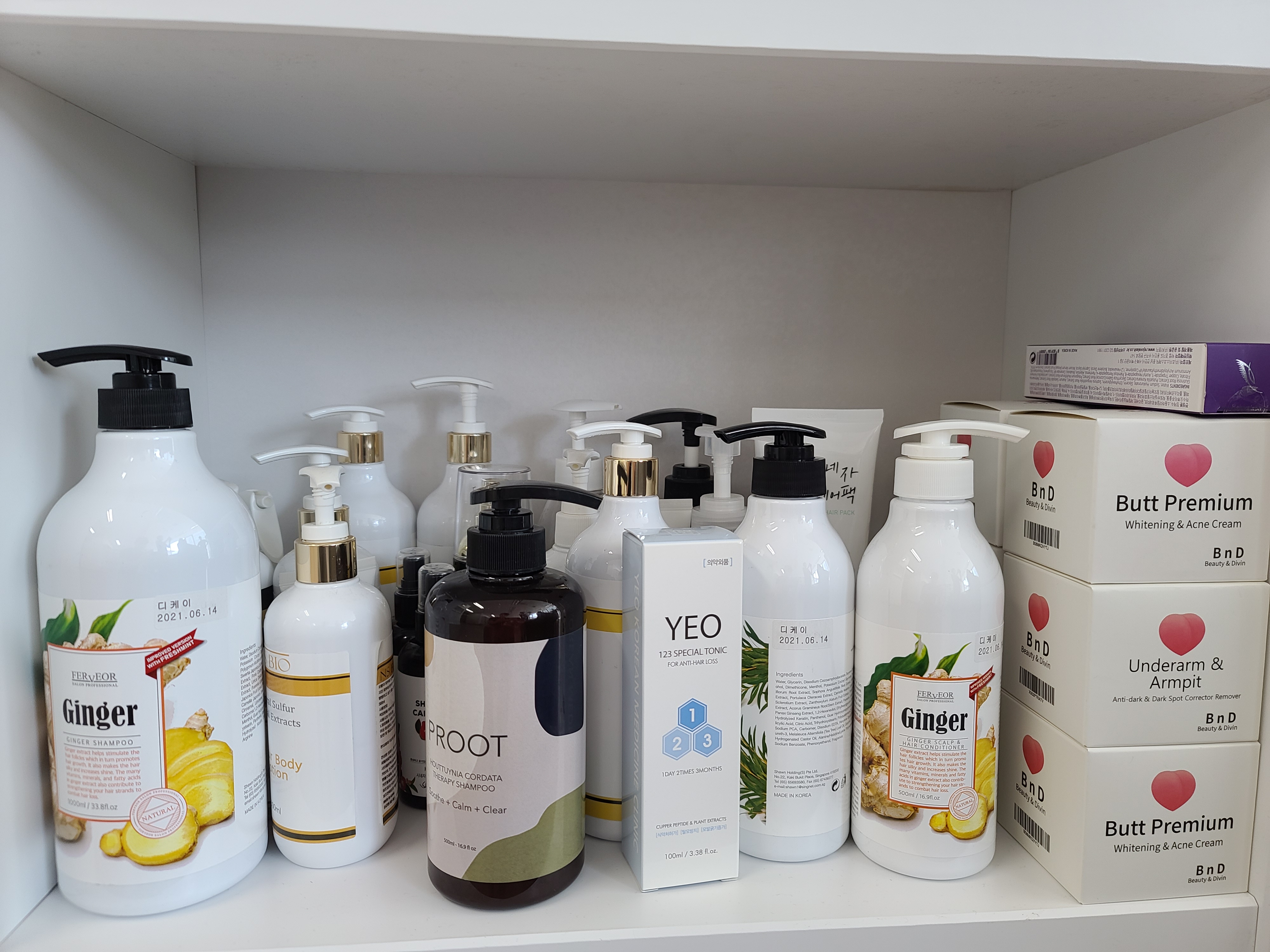 기업의 문을 열고 들어가자마자 위와 같은 박랩이 제조에 참여한 코스메틱 제품들이 즐비하게 전시되어 있었습니다.
