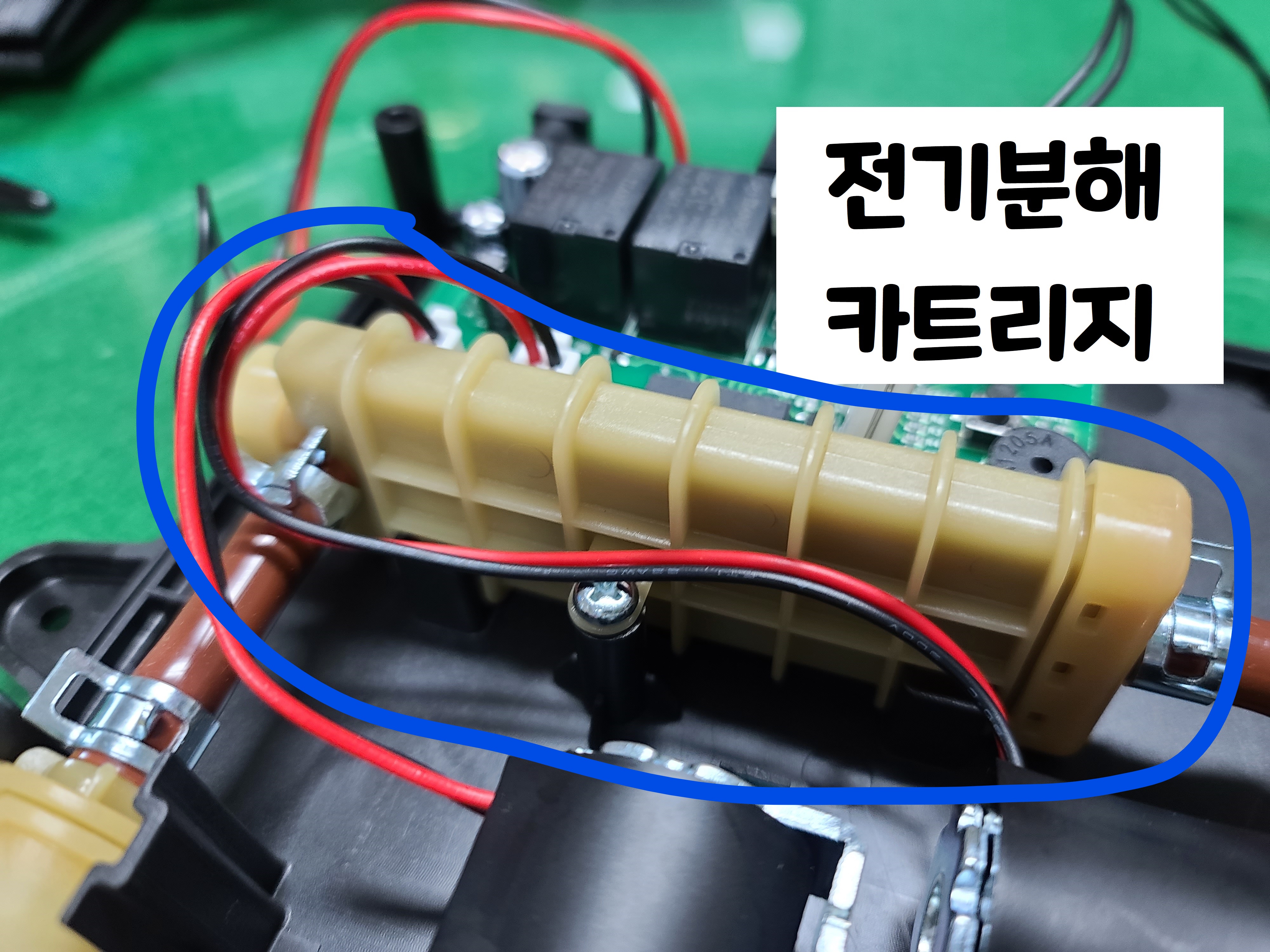 수돗물이 전해수기 안쪽에 있는 전기분해 카트리지와 만나서 전기 분해됩니다.