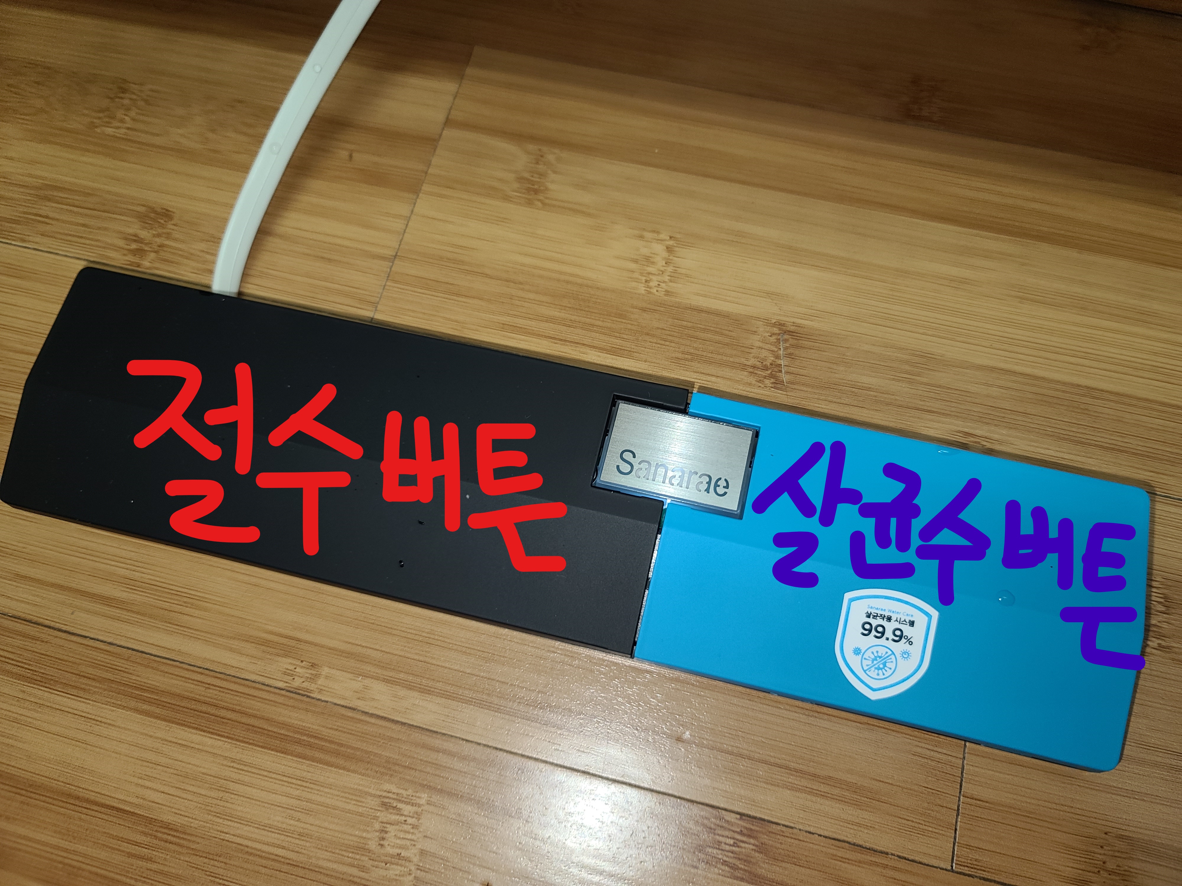 전해수기의 오른쪽 파란색 버튼을 누르면 살균수가 추출됩니다.