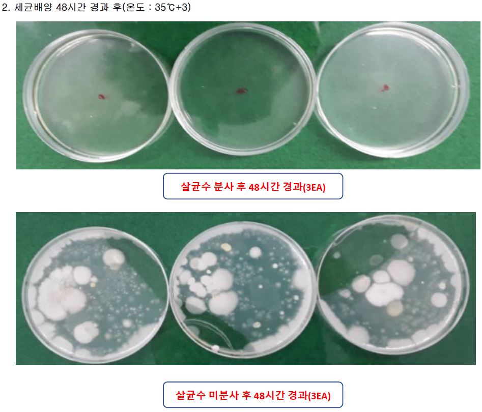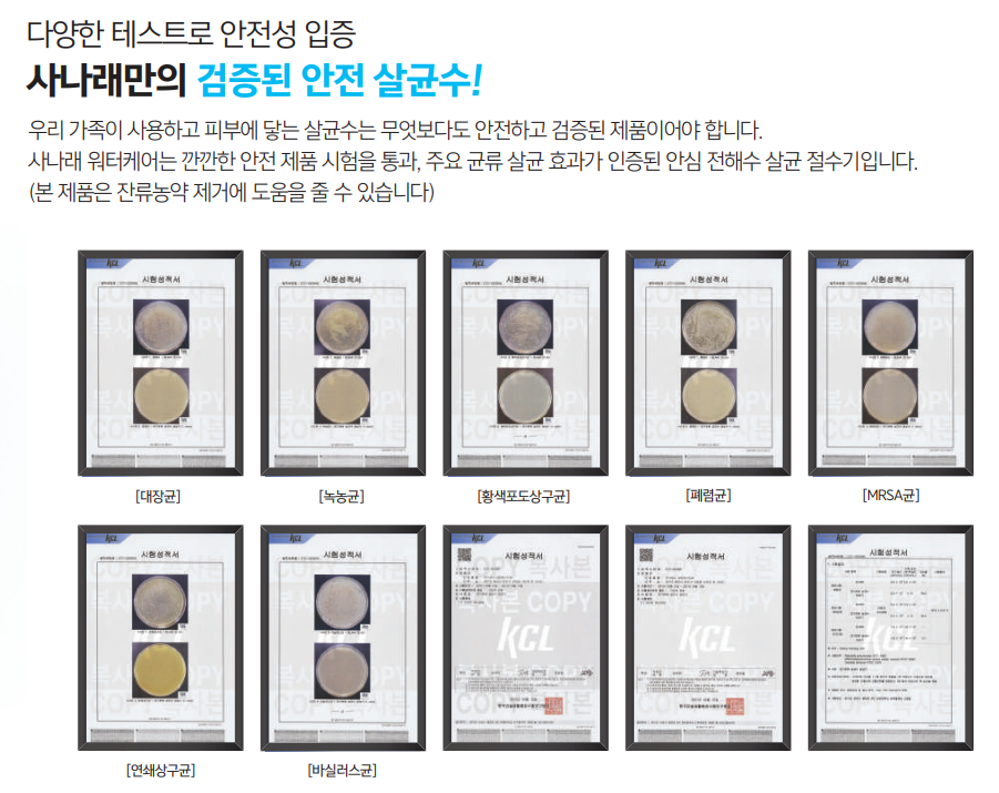 실제로 전해수기를 이용해 뽑은 살균수로 황색포도상구균 등과 같은 세균을 살균한 자료를 볼 수 있었습니다.