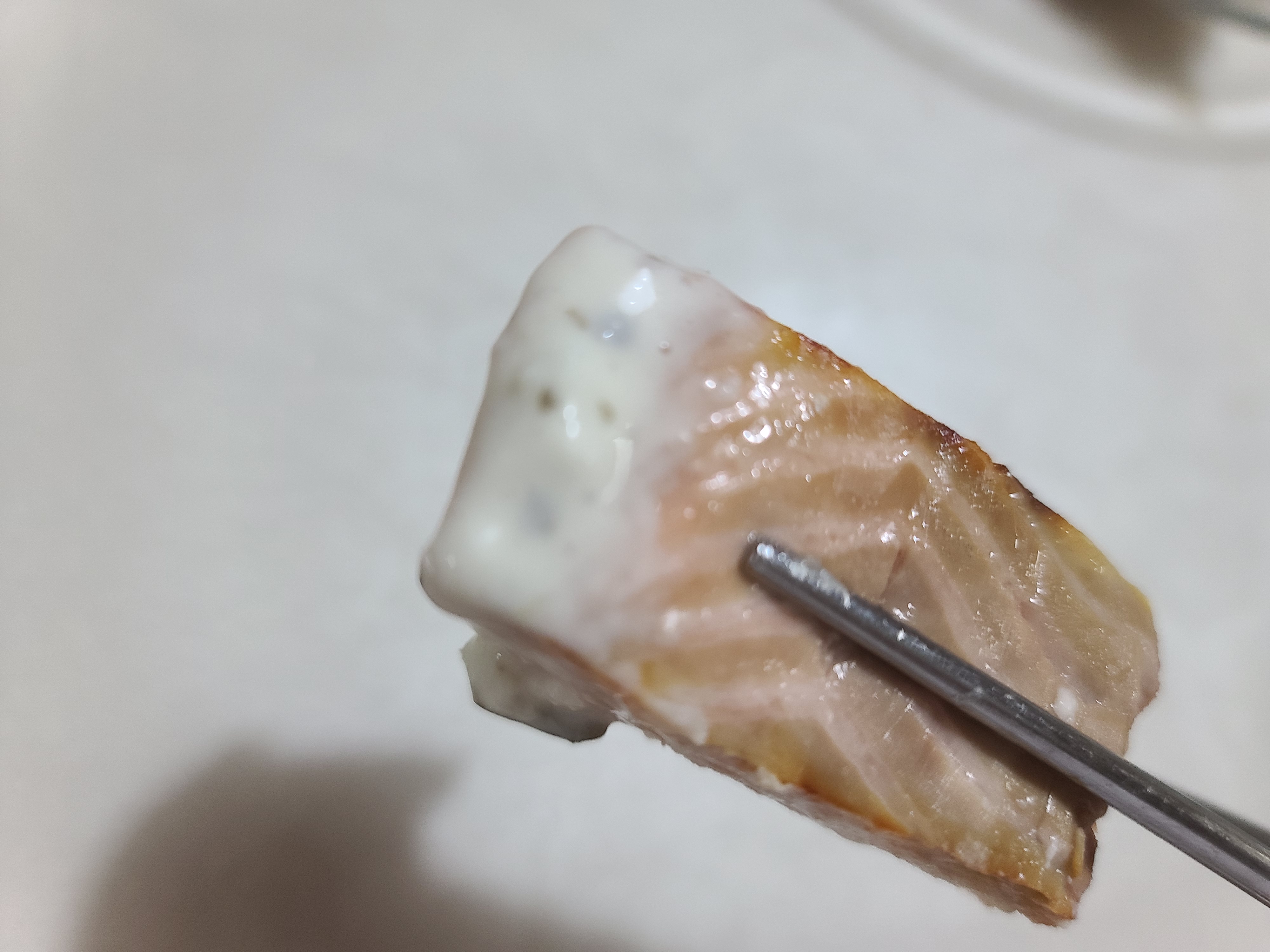 해동을 하지 않고 조리를 해서 그런지 연어가 푸석푸석해보입니다.