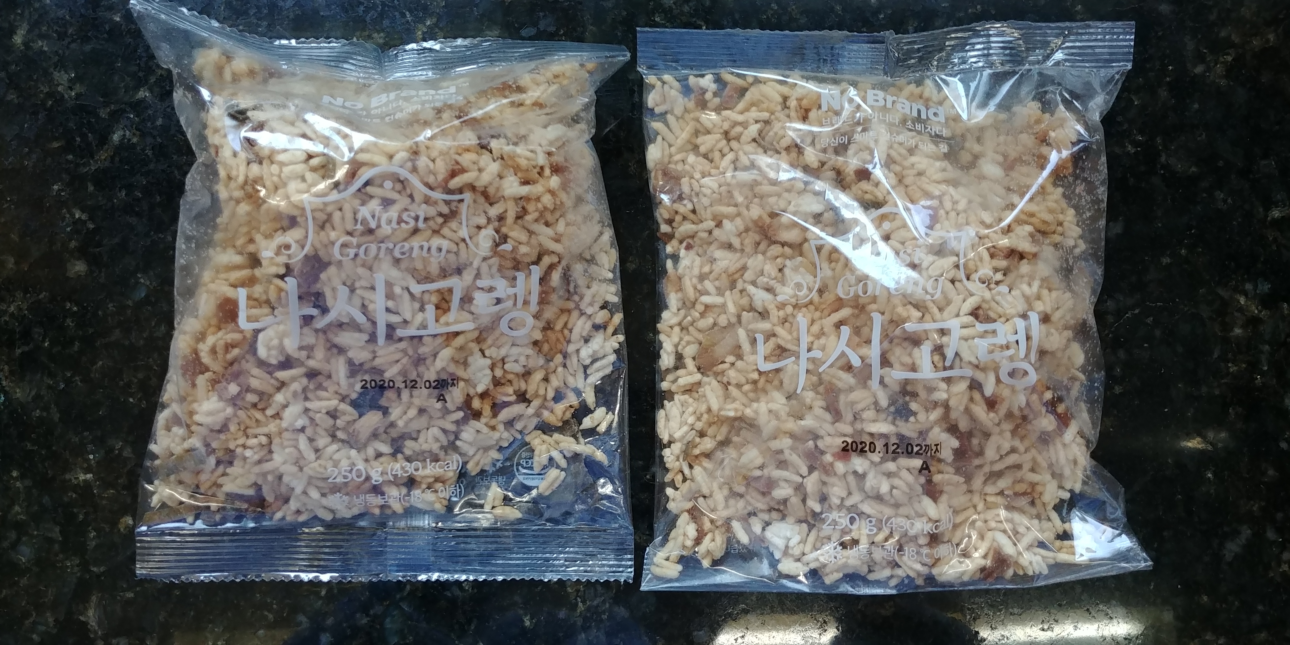 제품을 개봉하면 이렇게 두 개의 노브랜드 나시고렝(나시고랭) 볶음밥이 개별 포장되어있습니다. 저는 형과 같이 먹었기 때문에 두 개 다 조리해보도록 하겠습니다.